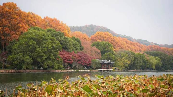 近处湖岸有枯荷的赭褐色,稍高些是对岸湖边几簇枫树格外醒目的红色,然后是梧桐的橙黄色,再往上是各种树木或深或浅的绿,其间还点缀着一些红色。