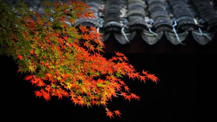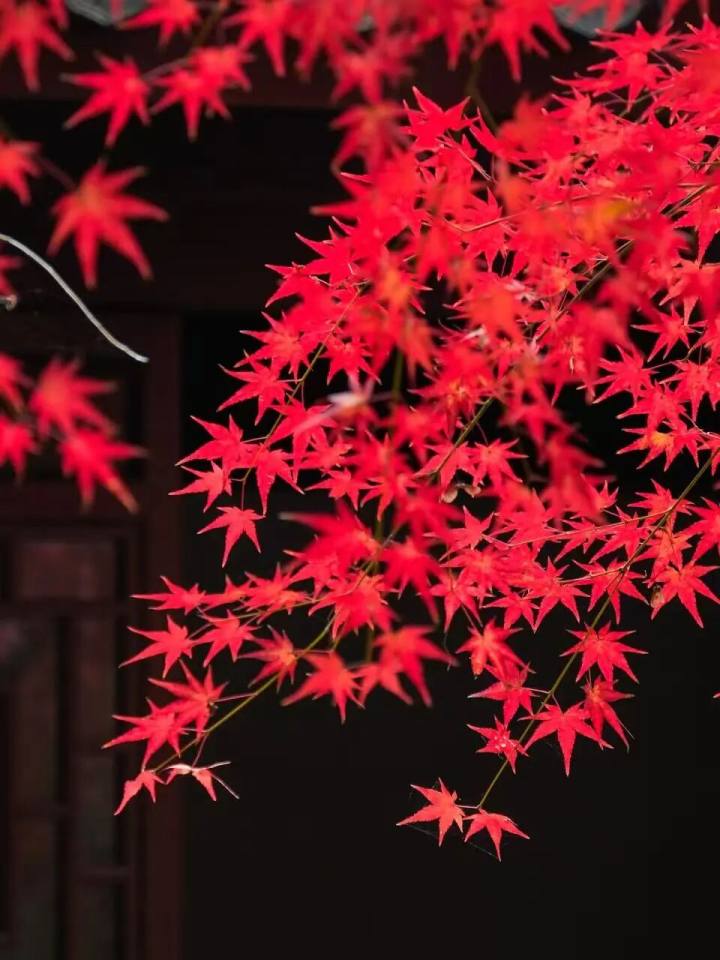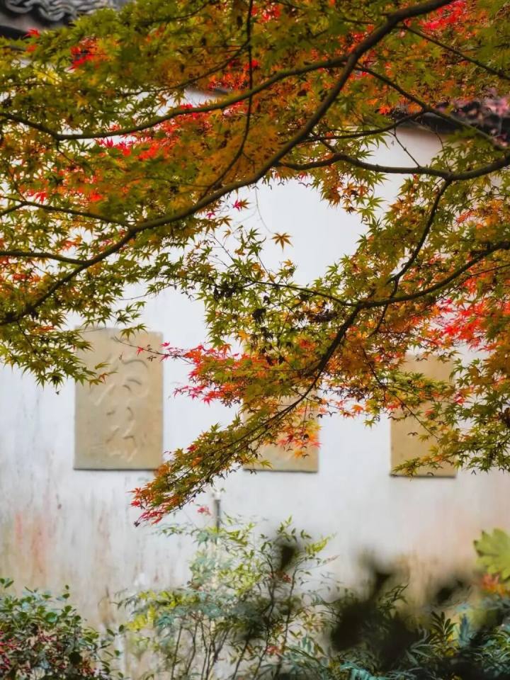 枫叶红得很有层次,有的鲜红欲滴,有的带着些许橙黄或青绿,在古朴院墙的衬托下,充满了中式美学的意境。
