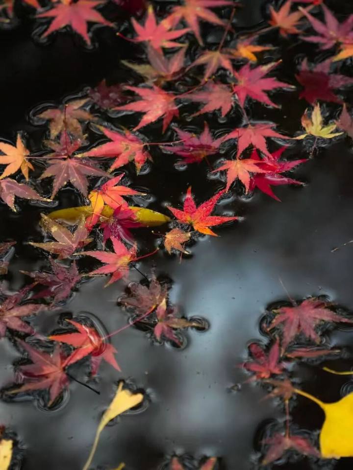 树下有一方小小的水池,水面上漂浮着许多零落的红叶,随着微波轻轻荡漾,静谧得像一幅画。
