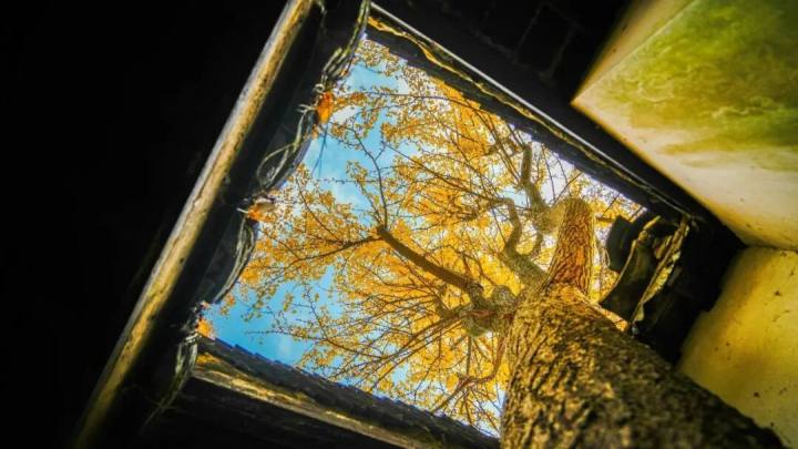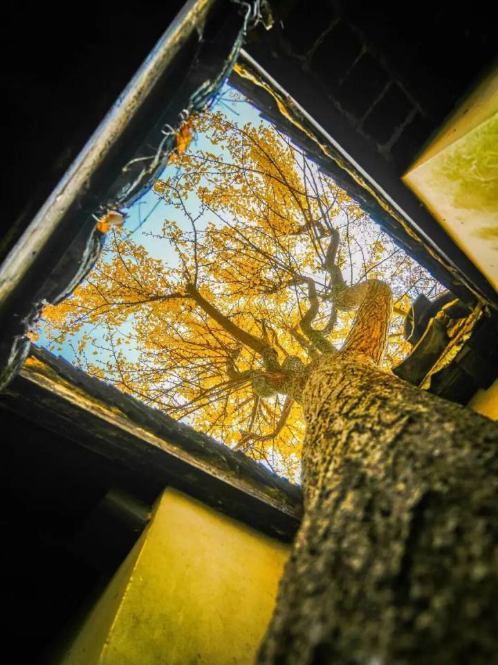 站在树下仰头望去,院墙合围成一个小“天井”,高大的银杏树冠仿佛其中一把洒满阳光的金色华盖,在湛蓝天空的映衬下,每一片叶子都显得通透而明亮。