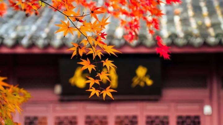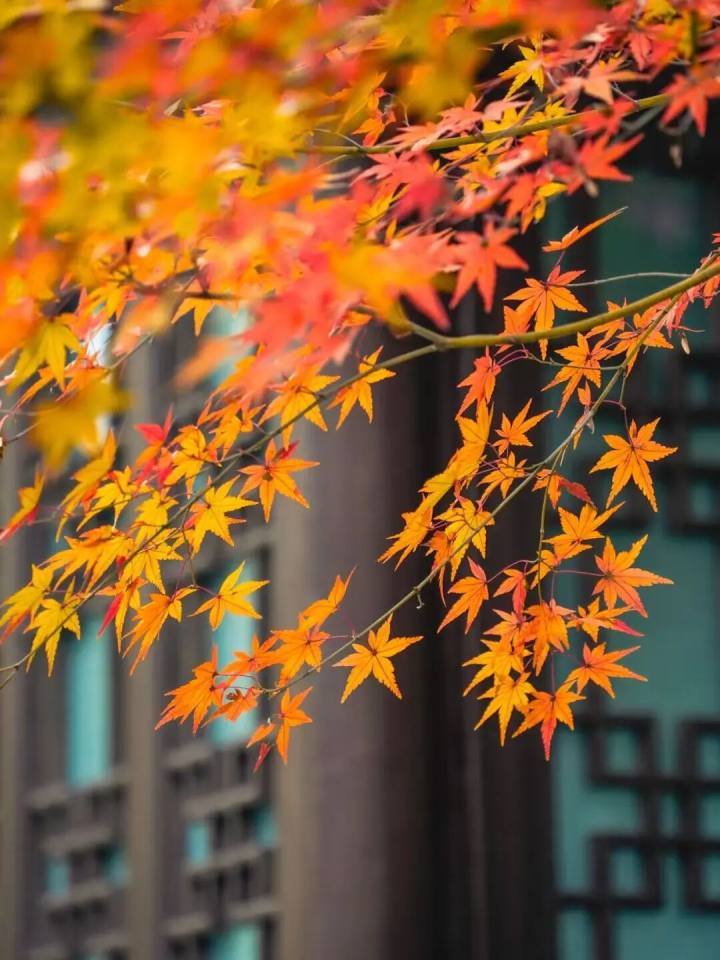 枫叶的色彩极为丰富,有的正处于青红相间的变色期,如同被水彩淡淡晕染;有的则已彻底红透,在阳光的照射下,红得像宝石一样熠熠生辉,衬着飞檐翘角,将中式美学的韵味演绎到了极致。