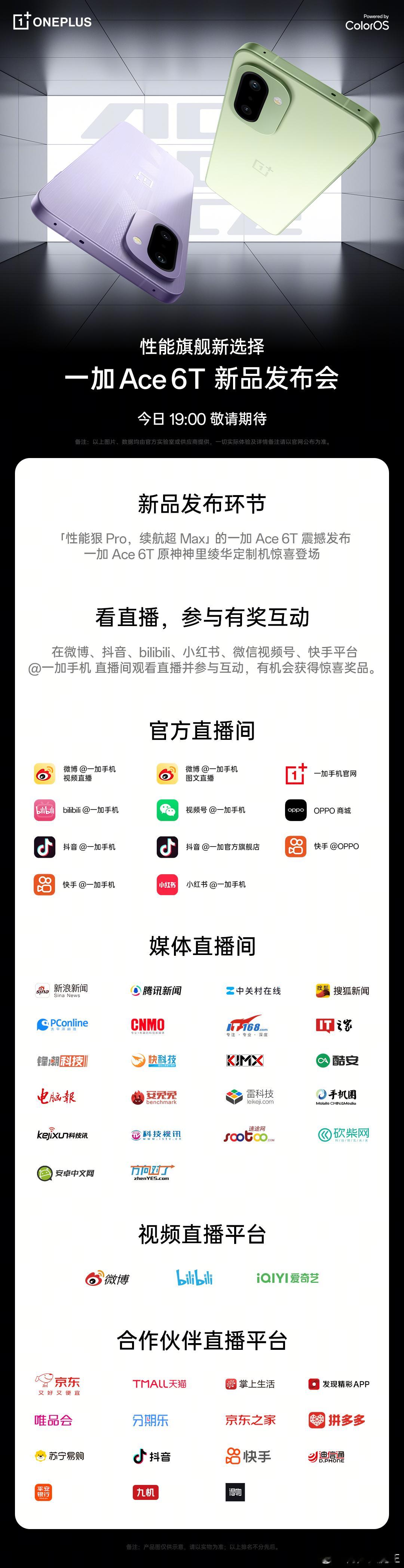 今晚看『一加手机』新品发布还有礼物可以拿哦在微博、抖音、B 站、小红书、微信视频号、快手平台,观看一加ace6t新品发布 直播,参与互动有机会赢取礼品~ 🎁今晚19点,不见不散