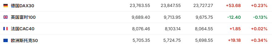 2.截至发稿,德国DAX指数涨0.23%,英国富时100指数跌0.13%,法国CAC40指数涨0.02%,欧洲斯托克50指数涨0.34%。