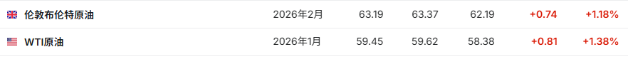 3.截至发稿,WTI原油涨1.38%,报59.45美元/桶。布伦特原油涨1.18%,报63.19美元/桶。
