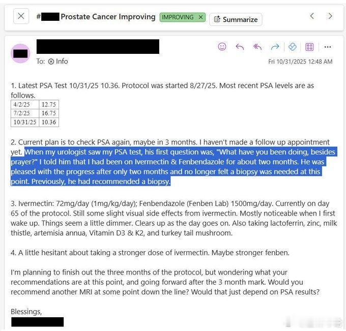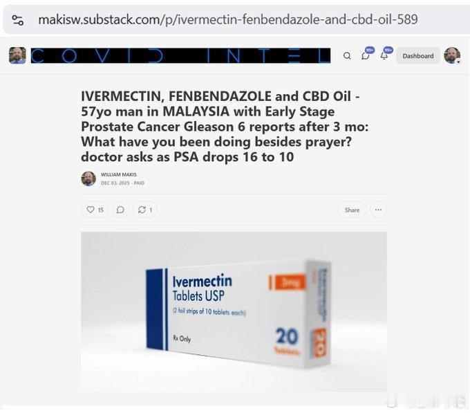 🔥🔥肿瘤专家威廉·马基斯医生再分享伊维菌素、芬苯达唑与 CBD 油成功案例x.com/aus_mini/statu…马来西亚一名 57 岁早期前列腺癌患者(Gleason 6)3 个月后 PSA 显著下降治疗方案:伊维菌素 72 mg/天芬苯达唑 1500 mg/天结果:PSA 从 16.7 降至 10患者称,泌尿科医生看到检查结果后惊讶问道:“除了祷告,你都做了些什么?”😆