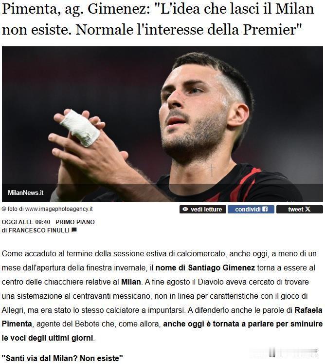 冬季窗口有可能不会补充锋线。希门尼斯经纪人表示希门尼斯从未想过离开米兰,他会留在球队,我不清楚为什么媒体一直都有关于希门尼斯的离队传言。 希门尼斯的经纪人皮门塔接受ESPN采访表示英超俱乐部对他有意,我毫不意外。有一家、两家或三家俱乐部感兴趣在我看来都很正常,但他离开米兰的想法根本不存在。希门尼斯从未想过离开米兰,之前没有未来也不会有。同时我可以负责任的告知所有米兰球迷,米兰俱乐部从未与我探讨过希门尼斯的去留,每次媒体炒作过热时,我都会联系米兰,而米兰总是回应:不,我们很平静,一切都好,谢谢。 如果希门尼斯冬季窗口不离开,我们不可能有新的前锋加入,当然如果恩昆库离开,那就另当别论了,但恩昆库离开的可能性更低,他的转会费与工资除了英超没有人能接手,恩昆库回英超已经没啥希望了,相对于希门尼斯其实恩昆库的表现更令人绝望,要跑动没跑动,要突然没突然,我怀疑我们买的不是那个恩昆库,咱们可能被骗了。