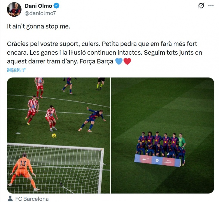奥尔莫本人在社交媒体发文,为自己鼓劲。奥尔莫上传了自己对阵马竞的进球瞬间,以及巴萨全队的合影,并配文写道:“这阻止不了我。”