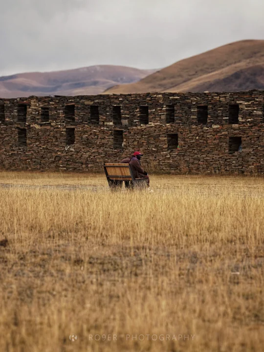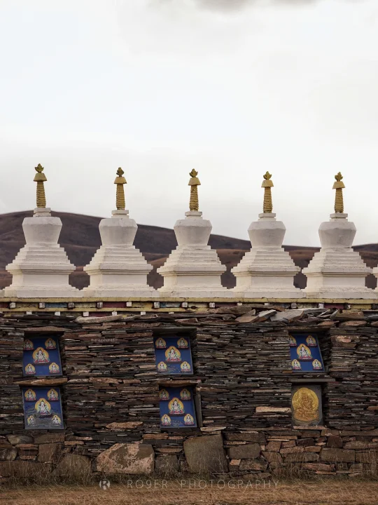 色须寺继续向北15公里,巴格玛尼石经墙就伏在广袤的草甸上。从300多年前僧人放下第一块玛尼石开始,随着信众的不断垒砌,其长度如今已达到惊人的1.7公里,堪称世界之最。目前墙身最高处3米,厚度也有2米以上,108座白色佛塔穿插其中,内部回环宛如迷宫,每一片石板上都刻满密密麻麻的经文,每隔不远即是小小的石窗,用以供奉藏传佛教石板画或是佛像