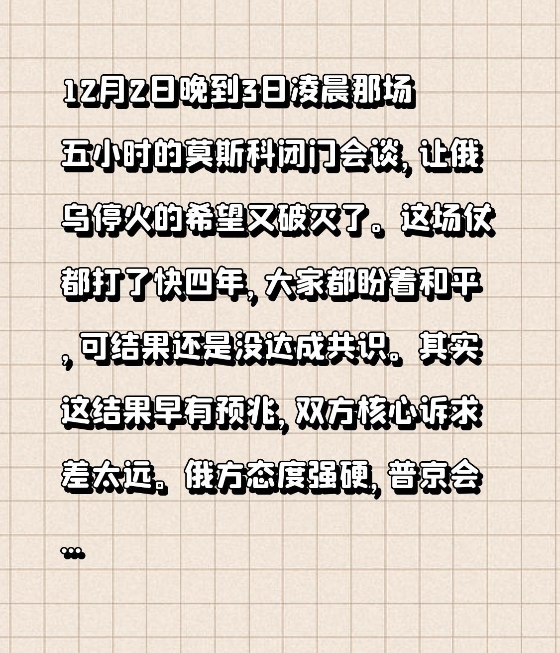 12月2日晚到3日凌晨那场五小时的莫斯科闭门会谈,让俄乌停火的希望又破灭了。这场仗都打了快四年,大家都盼着和平,可结果还是没达成共识。 其实这结果早有预兆,双方核心诉求差太远。俄方态度强硬,普京会谈前穿军装视察前线,还宣布控制了部分城市,强调握有战场主动权。谈判时俄方坚持三大红线,比如乌要承认俄对顿巴斯主权等。而美方“和平计划”改来改去,不敢碰关键问题,只想着在现有接触线停火。这样各说各话,谈判自然谈不拢。这仗到底还要打到什么时候,真是让人无奈又揪心。 从当前局势来看,美国在背后的搅弄风云是俄乌难以停火的重要因素。美国不断向乌克兰提供军事援助,表面上是支持乌方自卫,实则是为了延长这场战争,以此削弱俄罗斯的国力。美国的军工复合体在战争中赚得盆满钵满,他们可不想看到战争过早结束。 而对于俄罗斯来说,自身的安全利益不容侵犯。顿巴斯地区对于俄罗斯有着重要的战略意义,这不仅仅是领土问题,更是关乎到俄罗斯周边的安全稳定。俄罗斯不会轻易在核心利益上让步,毕竟历史上的教训让俄罗斯深知国家安全的重要性。 乌克兰夹在美俄之间,处境十分艰难。国内经济因为战争遭受重创,民众生活苦不堪言。但乌克兰在一定程度上被美国裹挟,难以按照自己的意愿去推动和平进程。 国际社会也在不断呼吁双方保持克制,通过和平谈判解决争端。联合国多次组织会议,试图为俄乌双方搭建沟通的桥梁,但都收效甚微。一些中立国家也积极斡旋,希望能找到一个双方都能接受的解决方案。 这场战争的持续,受伤最深的还是普通民众。无数家庭支离破碎,孩子们失去了美好的童年,人们每天都生活在恐惧和不安之中。也许只有当双方真正意识到和平的珍贵,放下成见,以平等、互信的态度重新回到谈判桌前,这场战争才有可能真正结束。但目前来看,这似乎还有很长的路要走。 俄美乌和平谈判 俄美乌停火谈判 美乌和平谈判 美俄乌停战协议 美俄涉乌谈判 美俄乌克兰谈判 美俄乌动态