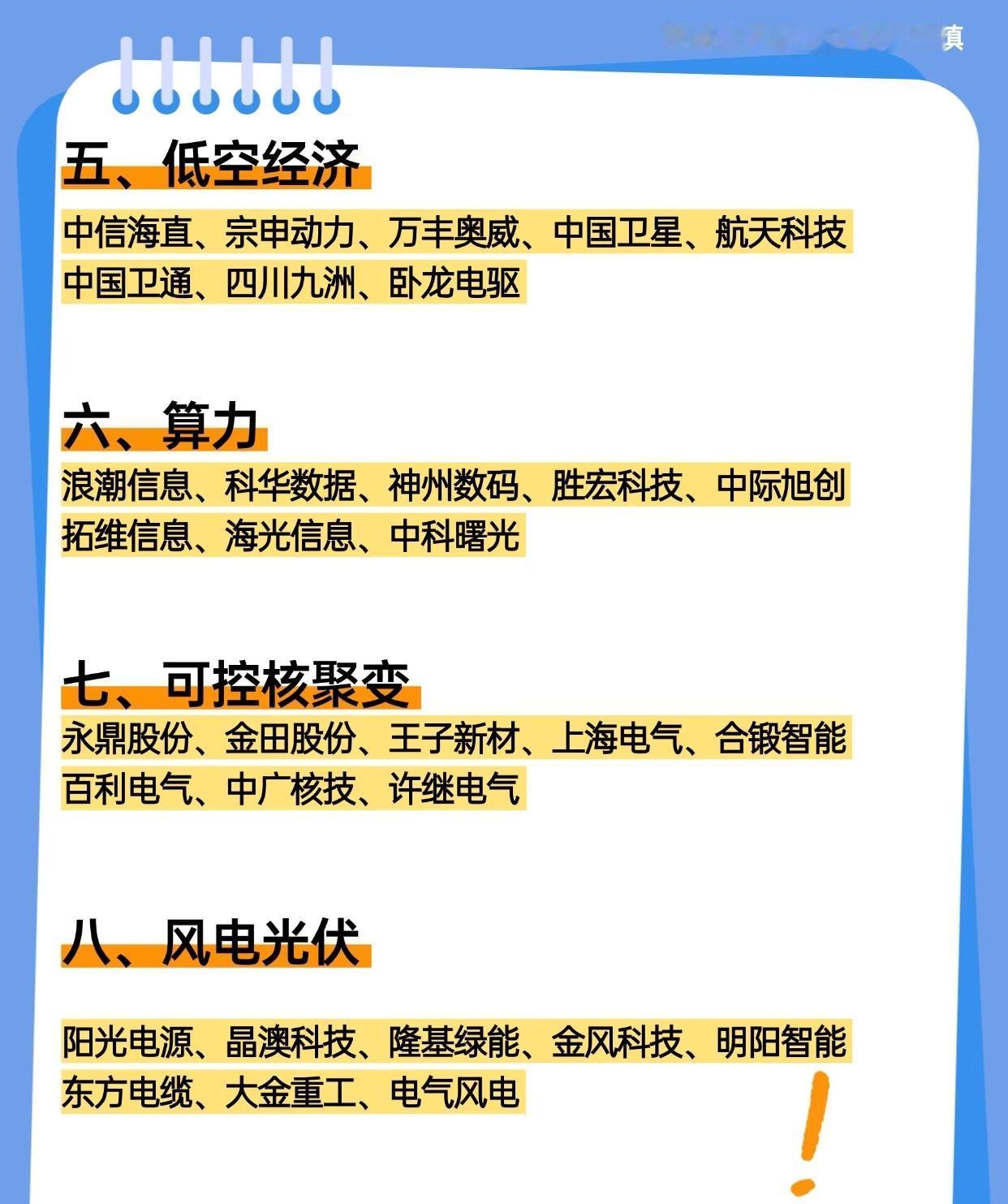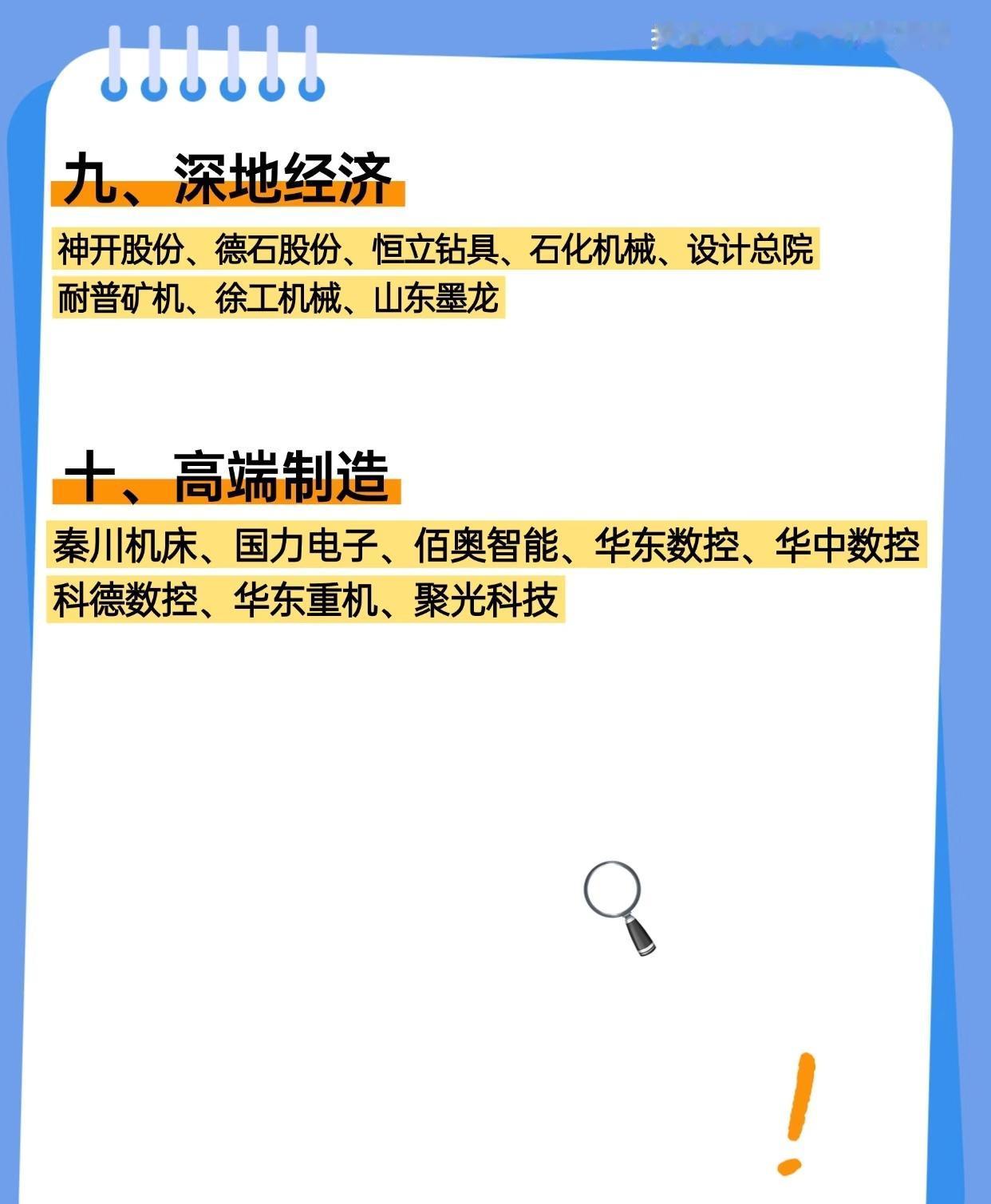 围绕“重要会议 十大核心方向”展开,依次介绍了十个重点领域的代表性企业,并附有“投资有风险,入市需谨慎”的风险提示。 第一张图涵盖前四个方向:芯片半导体包括中芯国际、长川科技、华虹公司、兆易创新、海光信息、芯原股份、张江高科、北京君正;人形机器人包括长盛轴承、鸣志电器、中大力德、五洲新春、三花智控、绿的谐波、柯力传感、卧龙电驱;脑机接口包括南京熊猫、翔宇医疗、佳禾智能、爱朋医疗、创新医疗、科大讯飞、三博脑科、中科信息;固态电池包括先导智能、天际股份、天赐材料、国轩高科、赣锋锂业、当升科技、诺德股份、宁德时代。 第二张图介绍第五至第八个方向:低空经济包括中信海直、宗申动力、万丰奥威、中国卫星、航天科技、中国卫通、四川九洲、卧龙电驱;算力包括浪潮信息、科华数据、神州数码、胜宏科技、中际旭创、拓维信息、海光信息、中科曙光;可控核聚变包括永鼎股份、金田股份、王子新材、上海电气、合锻智能、百利电气、中广核技、许继电气;风电光伏包括阳光电源、晶澳科技、隆基绿能、金风科技、明阳智能、东方电缆、大金重工、电气风电。 第三张图呈现最后两个方向:深地经济包括神开股份、德石股份、恒立钻具、石化机械、设计总院、耐普矿机、徐工机械、山东墨龙;高端制造包括秦川机床、国力电子、佰奥智能、华东数控、华中数控、科德数控、华东重机、聚光科技。 整体来看,这十大方向覆盖了从前沿科技(芯片、机器人、脑机接口、固态电池、算力、可控核聚变)到能源与制造(风电光伏、深地经济、高端制造)以及新兴场景(低空经济),涉及多家在各自领域具有代表性的上市或重点企业,旨在聚焦未来产业布局与投资关注点。