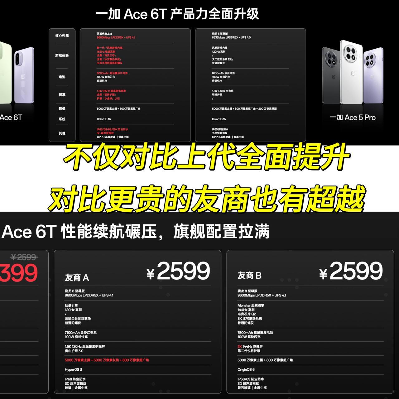 泥马!看完一加发布会发现是我唐突了,加料返降价,2399起,香麻了!简单总结发布会价格/配置 一加Ace6T, 12+256——2399元 16+256——2699元 12+512——2899元 16+512——3199元 16+1TB——3699元 原神绫华定制本月22日开售 16G+512GB —— 3699元 ◇ 163.4*77.1*8.1/8.3mm/216/211g ◇骁龙8Gen5 ✔️CPU:2×3.8GHz Oryon-L丨6×3.32GHz Oryon-M ✔️GPU:Adreno 829 ◇ LPDDR5X Ultra内存丨UFS 4.1闪存 ◇ 8300mAh双芯电池丨100W有线充电 ◇ 兼容55W PPS丨18W PD,旁路充电 ◇ 电竞三芯 自研电竞网络芯片 G2丨灵犀触控芯丨自研 Display P3 屏幕芯片 ◇冰河散热整机散热面积达 43940mm² ◇屏幕 6.83英寸居中打孔1.5K直屏丨165Hz LTPS刷新率 290Hz十指采样率丨天马屏丨类DC/PWM调光丨450ppi丨晶盾玻璃 ◇影像 50MP IMX906 OIS 主摄 8MP IMX355 超广角 16MP IMX480 前置 ◇铝合金金属边框丨玻璃玻纤后盖丨自定义实体快捷键 ◇立体双扬丨X轴线性马达 ◇IP66/68/69/69K 等级防尘防水 ◇3D超声波丨红外遥控丨双频GPS丨NFC丨WiFi 7丨USB 2.0 怎么说呢,一加算是不管不顾了,发布前都不看好8Gen5,说一加Ace6T就是Ace5Pro迭代,定价指定比Ace6高。结果呢,加量返降价,2399起步。友商都嚷嚷的内存和存储涨价呢? 还有就是电竞属性拉满,独挡的165Hz直屏,电竞核心三芯都跟一加15一样。散热也是足足铺满了冰河散热系统,咱就是说怪不得李杰能自信介绍3小时游戏都几乎满帧不掉呢,这在同档真无敌了 所以之前说一加Ace6T会翻车的人呢[捂脸],这波打游戏真比骁龙8Elite的机子强,完事儿还更便宜,有旗舰机的质感,主摄也高度可用,防水也全面拉满。真就是两千元档游戏机中的均衡水桶旗舰了呗~ 当然了,得奉劝各位一句,内存存储涨价已成定局,一加这次没涨是诚心交朋友,需要换机的就抓紧首销无脑入。以前都说早买早享受,晚买享折扣。但这次涨价风波反过来了,一加Ace6T早买早享受,早买早享200元折扣,而且1元首销礼真送了不少东西...大家觉得一加Ace6T怎么样?