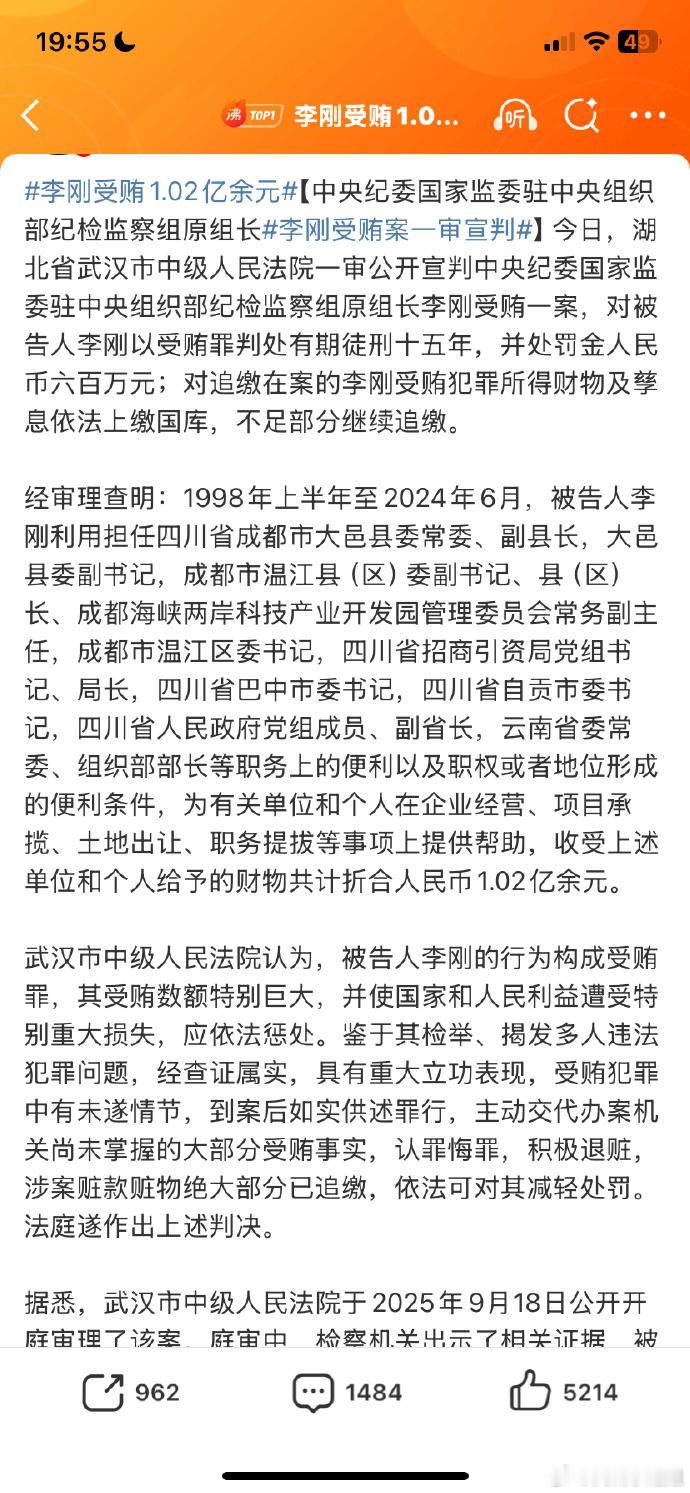 部级贪官【中央纪委国家监委驻中央组织部纪检监察组原组长李刚受贿案一审宣判】李刚受贿1.02亿余元湖北省武汉市中级人民法院于12月3日一审宣判,中央纪委国家监委驻中央组织部纪检监察组原组长李刚因受贿罪被判处有期徒刑十五年,并处罚金六百万元。经审理查明,李刚在1998年至2024年的26年间,利用担任四川省多个市县领导职务及省级领导职务的便利,非法收受财物共计折合人民币1.02亿余元。全网热点共创计划纪检监察组组长也贪腐!真很可怕。李刚受贿时间跨度长达26年,期间从副县长一路升迁至副省长,实现了“边腐边升”。这26年他“轻松”积累了一个“小目标”,也为自己铺就了通往秦城监狱的“腐败之路”,最终从家族的骄傲变为整个家族的耻辱。此案再次警示:当官就必须做廉洁的官。国家已给予公职人员优厚的物质待遇,理应知足常乐、履职尽责。任何逾越法律红线的腐败行为,无论隐藏多深、时间多久,终将受到法律的严惩,落得身败名裂的下场。