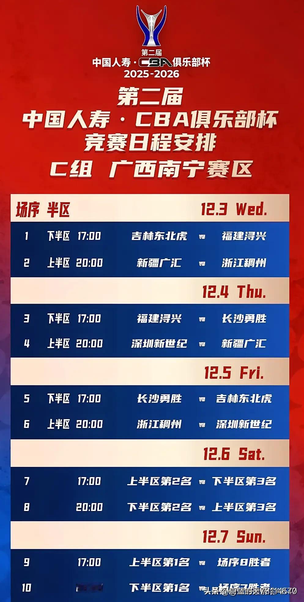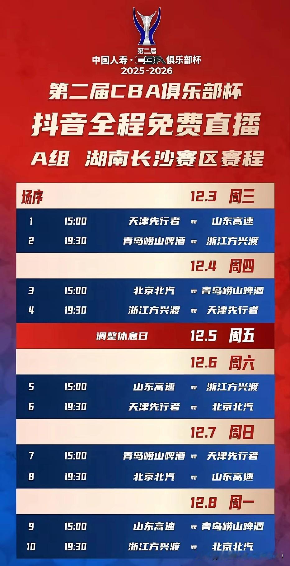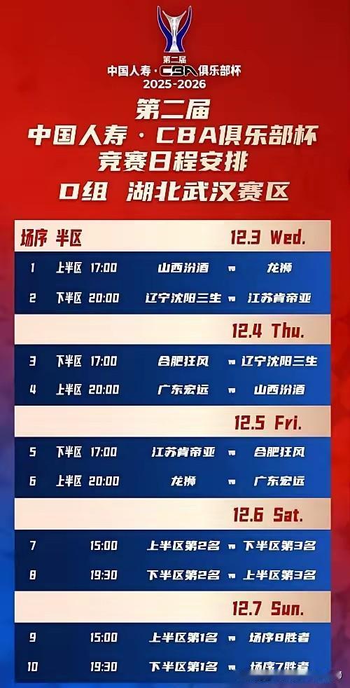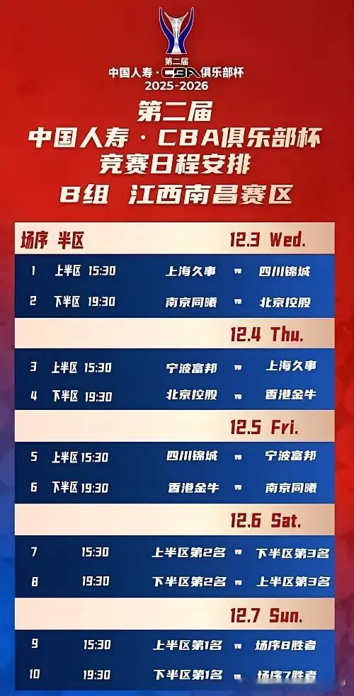 [玫瑰][玫瑰]第二届CBA俱乐部杯开赛首轮战报及赛区赛程安排: 一,湖南长沙赛区A组(5支队):√ 1,天津先行者90-106山东高速 2,青岛崂山啤酒99-103浙江方兴渡 二,江西南昌赛区B组(6支队):√ 1,上海久事111-72四川丰谷酒业 2,南京天之蓝96-98北京控股 三,广西南宁赛区C组(6支队):√ 1,吉林长白山恩都里85-80福建晋江文旅 2,新彊伊力特78-91浙江稠州 四,湖北武汉赛区D组(6支队):√ 1,山西汾酒85-82广州主朗肽海本 2,辽宁本钢78-85江苏肯帝亚 首届CBA俱乐部杯冠军四强:冠军上海久事,亚军新彊广汇,季军北京北汽,殿军山西汾酒。 第二届CBA俱乐部杯,分四个赛区进行(四个组,共计23支球队),采用赛会制。比赛分小组赛(12月3日-8日)和淘汰赛(2026年2月6日-12日,在内蒙古呼和浩特市进行)两个阶段。 获得各个小组单循环赛前两名的队晋级八强,淘汰赛阶段~采取单败淘汰制,直至决出冠亚季殿军。 附:各赛区赛程。