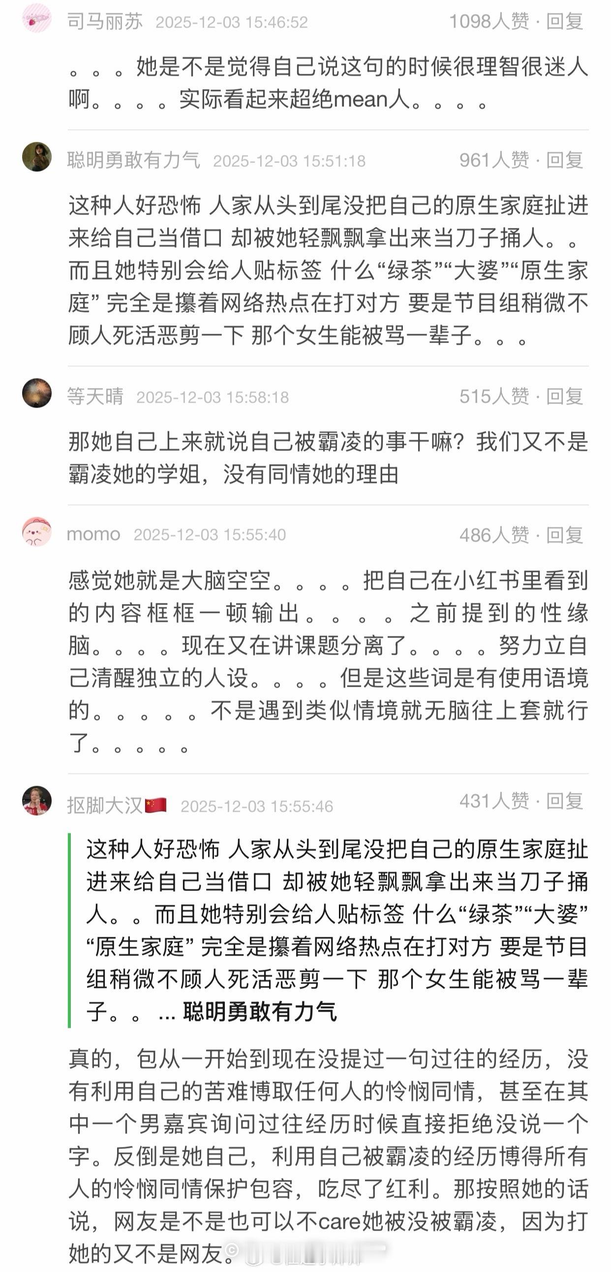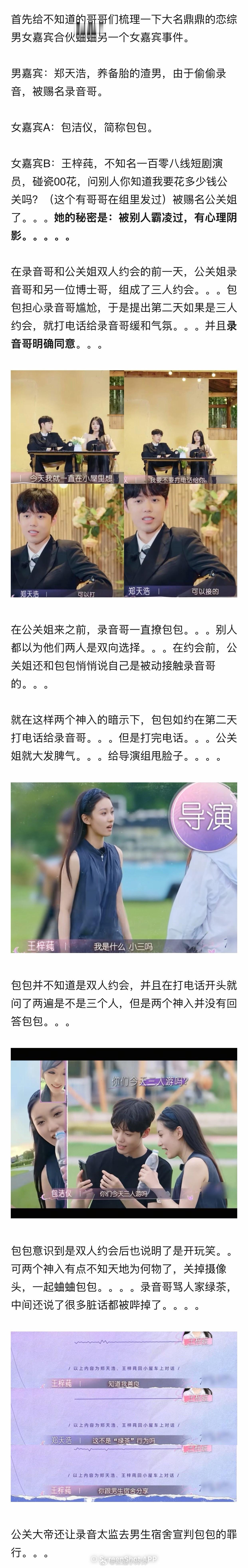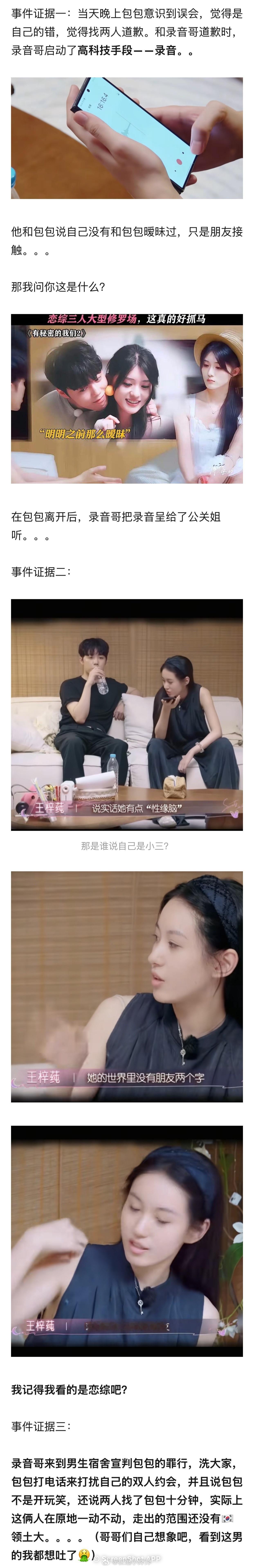 王梓莼瞅着有点像npd吧…包洁仪被原生家庭抛弃她:我没有办法原谅她,因为我不是她妈,抛弃她的不是我她对她的恨意之重好像包犯了什么天条一样包就只是在她跟男嘉宾约会时,打电话开了个玩笑让他俩找了她10min而已就这样一个玩笑,王就被激怒了引导录音哥一起说人家坏话不就是想让大家觉得的她是受害者一起从道德精神上谴责包嘛王还说自己被霸凌过有ptsd拜托,她这才是赤裸裸的针对性霸凌吧…王梓莼说同情包洁仪但无法原谅她于正不认识王梓莼王梓莼前男友
