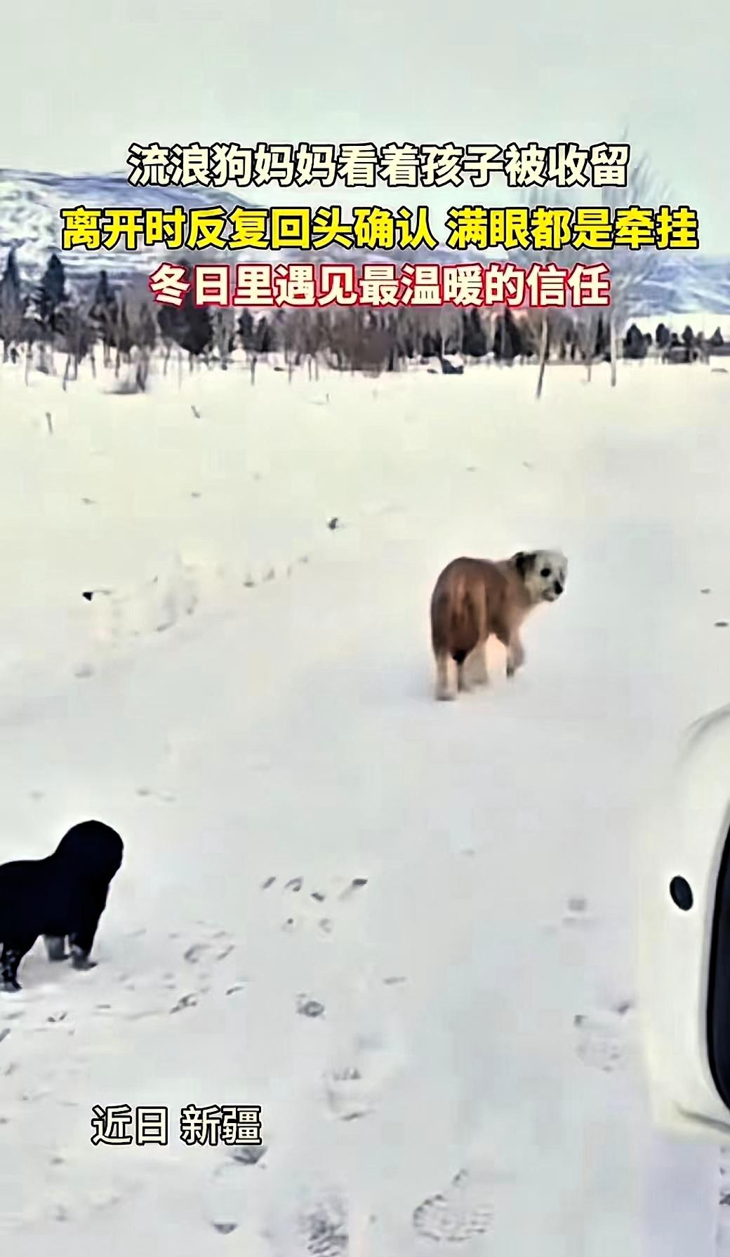 “看哭了!”新疆,一车主刚在路边停下休息,就有两只流浪狗跑了过来。一只是大狗,看着有点瘦,另一只是小狗,缩在大狗身边。 一开始车主没太在意,以为它们是来讨东西吃的。可接下来大狗的动作,让他一下子明白了。大狗叼起小狗,轻轻放在他面前,然后退后几步,看着他,眼神里像是有恳求。车主这才反应过来,狗妈妈是想把孩子托付给他。 小狗不太懂,挣脱开就往大狗那边跑,还小声叫着。大狗用鼻子蹭了蹭小狗,又抬头看了看车主,然后慢慢往后退,接着转身往远处走。 走几步就回头望一眼小狗,脚步放得很慢,看得出来很不舍,但还是一步步走远了。 车主一家人看着心里不是滋味,尤其是孩子,一直惦记着狗妈妈会不会还有其他宝宝。他们商量了一下,决定顺着大狗走的方向找过去。没走多远,就在一个背风的雪堆旁,找到了大狗,还有它藏在怀里的另外3只小狗崽。 他们把4只小狗都抱上了车,又想着狗妈妈独自在雪地里也不行。刚好遇到附近的牧民,说起这事,牧民愿意收养狗妈妈,还说会好好照顾它。现在4只小狗在车主家生活得很好,狗妈妈在牧民家也不用挨冻了。 网友们知道后,都说狗妈妈很聪明,知道自己护不住孩子,就找好心人托付;更夸车主一家善良,不是抱走小狗就完事,还特意回去找狗妈妈和其他幼崽,把事情办得很周全。 其实这事儿很简单,却让人心里暖暖的。母爱不分物种,狗妈妈为了孩子能放下警惕;而善意也很实在,车主一家看到了就尽力帮忙,不辜负这份信任。