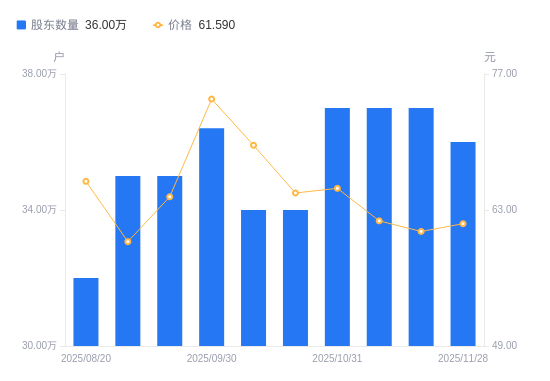日期A股户数(户)流通A股户均持股数(股)户均持股市值(万元)2025-11-283600004084.7025.162025-11-203700003974.3024.162025-11-103700003974.3024.592025-10-313700003974.3025.922025-10-203400004324.9728.002025-10-103400004324.9730.132025-09-303640224039.5630.062025-09-193500004201.4027.042025-09-103500004201.4025.102025-08-203200004595.2830.31
