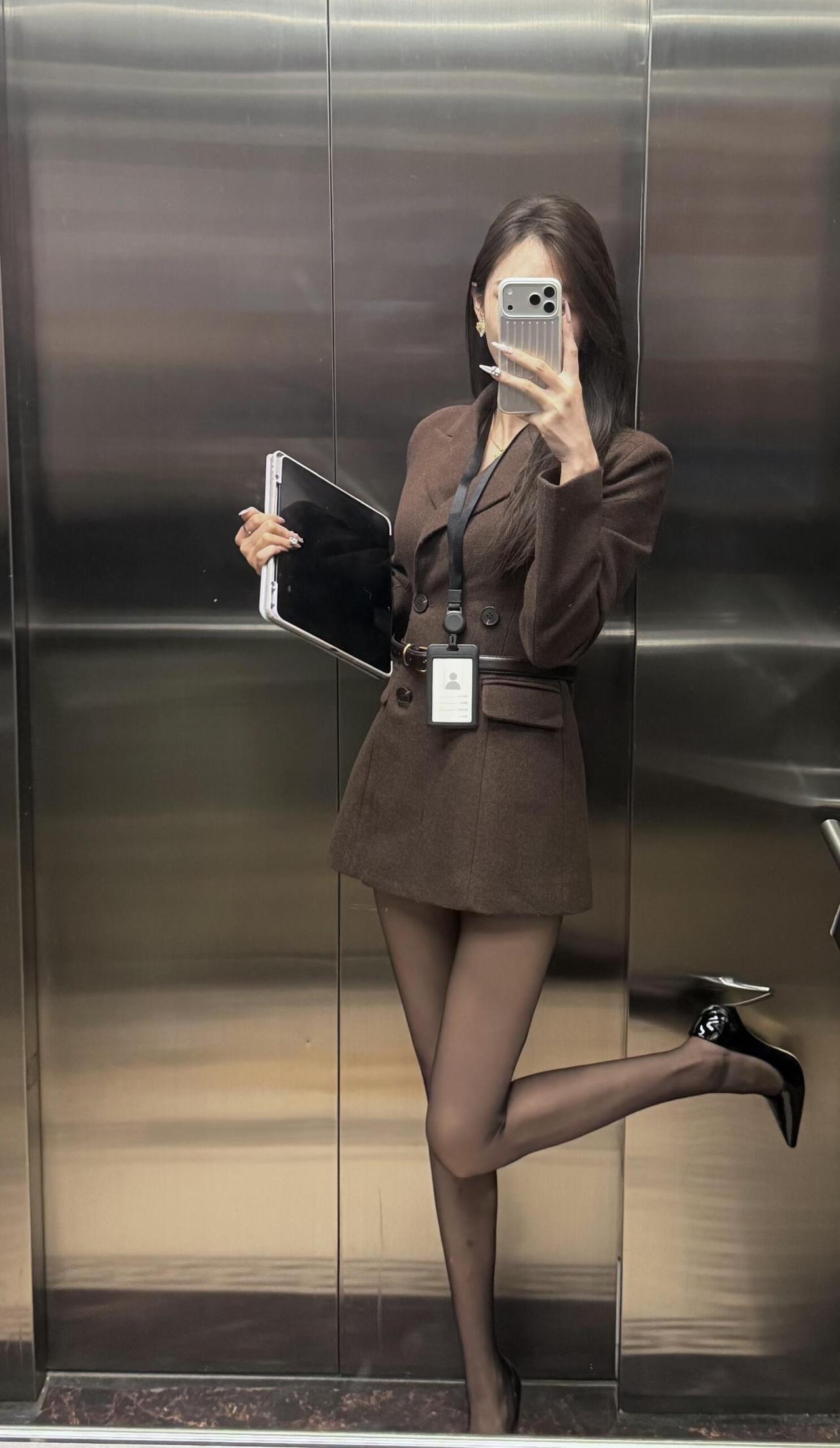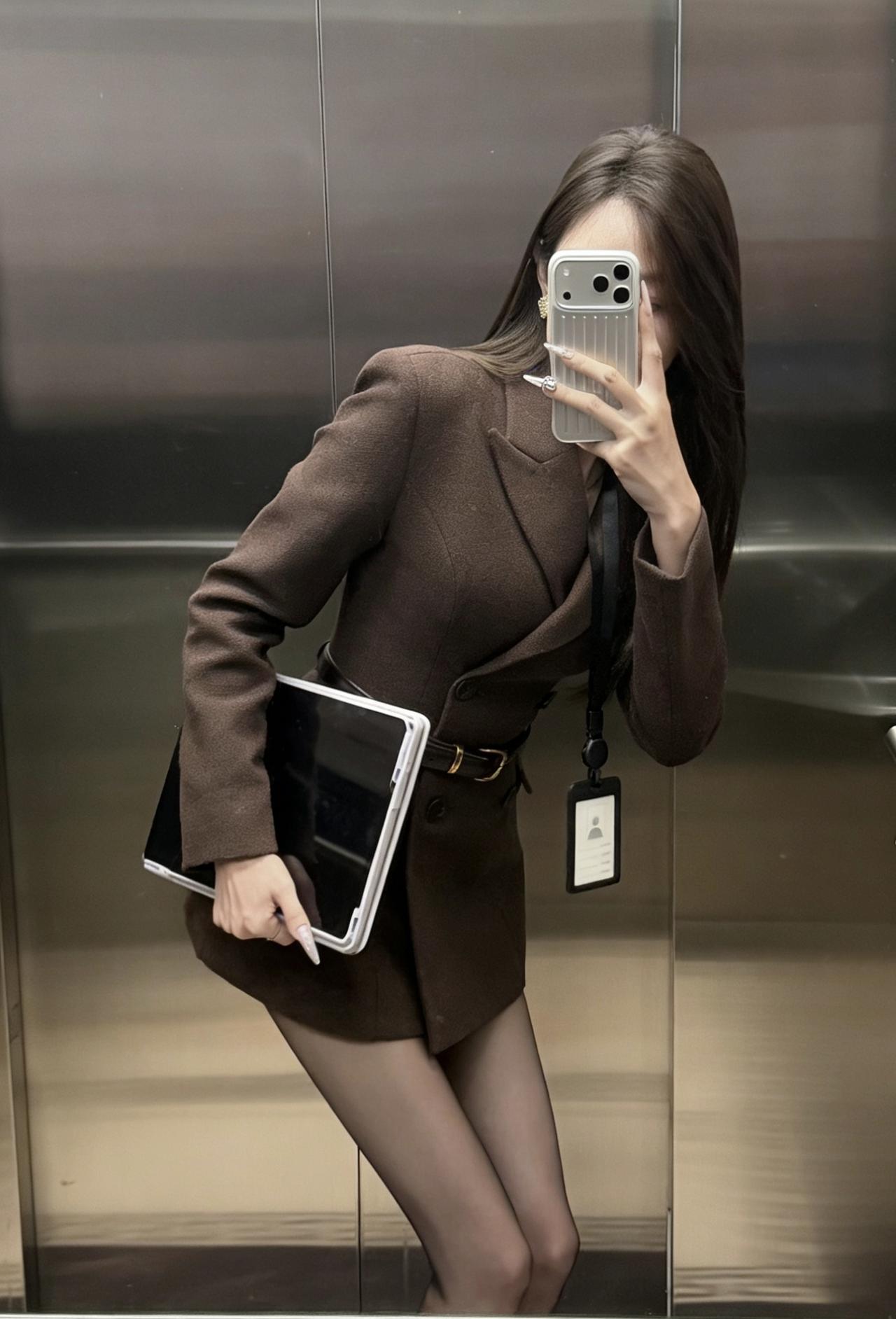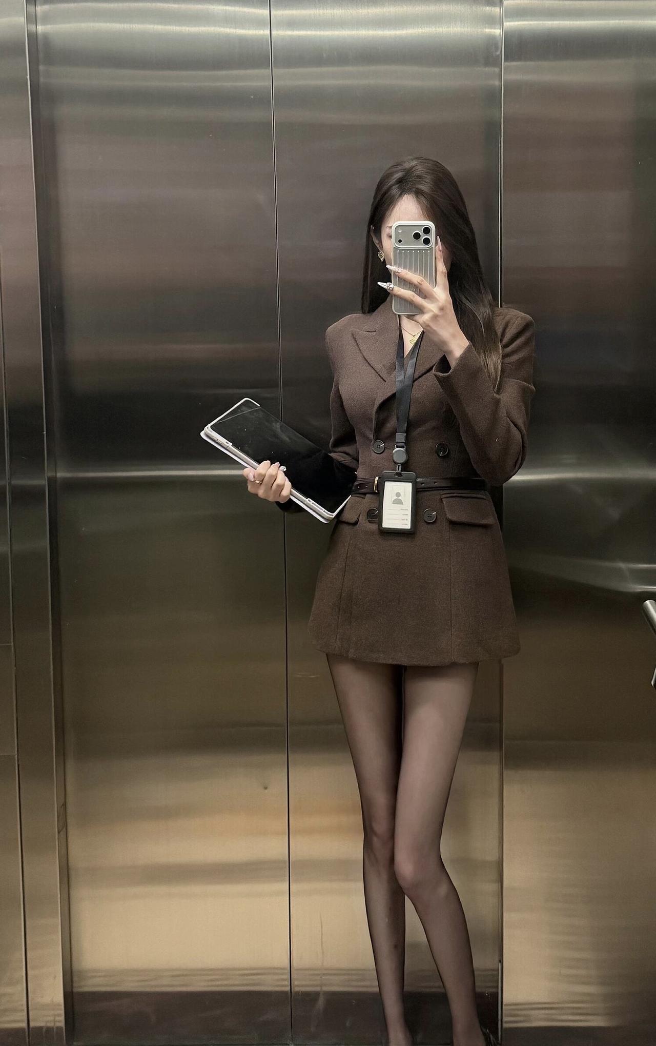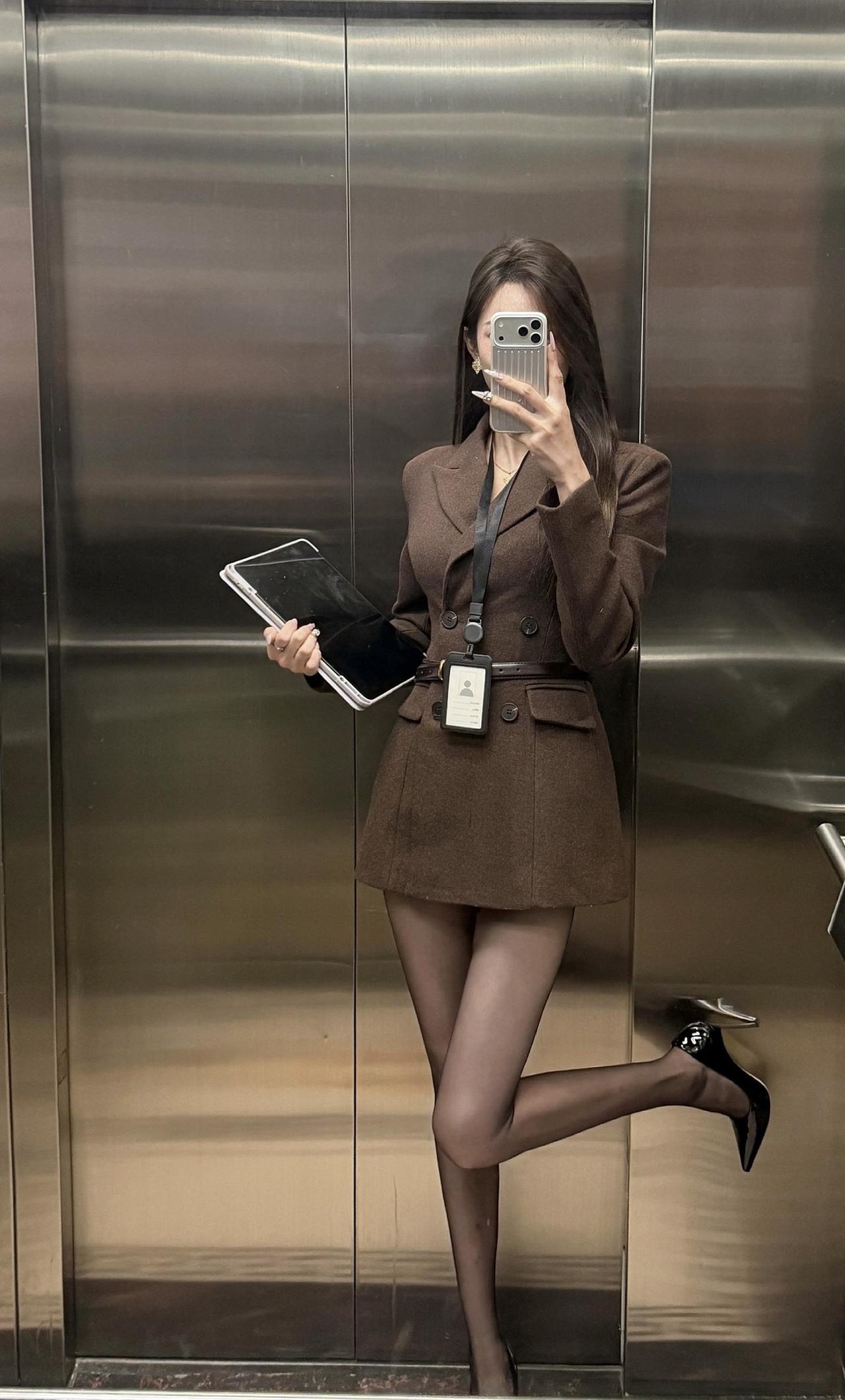 今日穿搭推荐:棕褐色收腰西装裙+打底裤+黑色高跟鞋的组合,风格是“轻熟职场风+精致辣妹感”,加上羽绒服或者皮毛,保暖又时尚。 收腰西装裙既保留了西装的干练,短款版型又增加了时尚感;黑丝和高跟鞋提升了精致度。 适合场合:日常通勤、逛街、轻职场场景、轻社交场合、非正式商务场合。