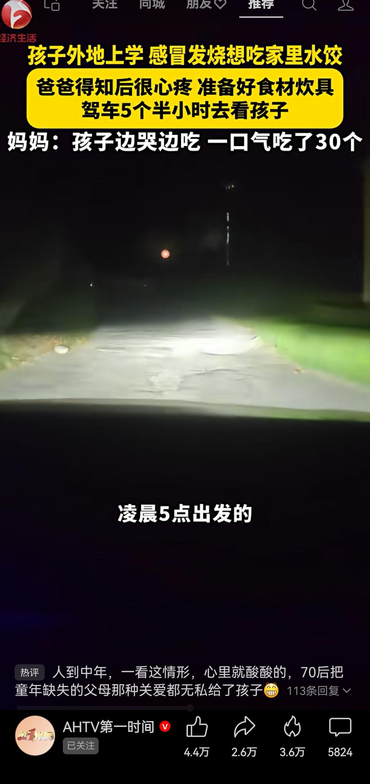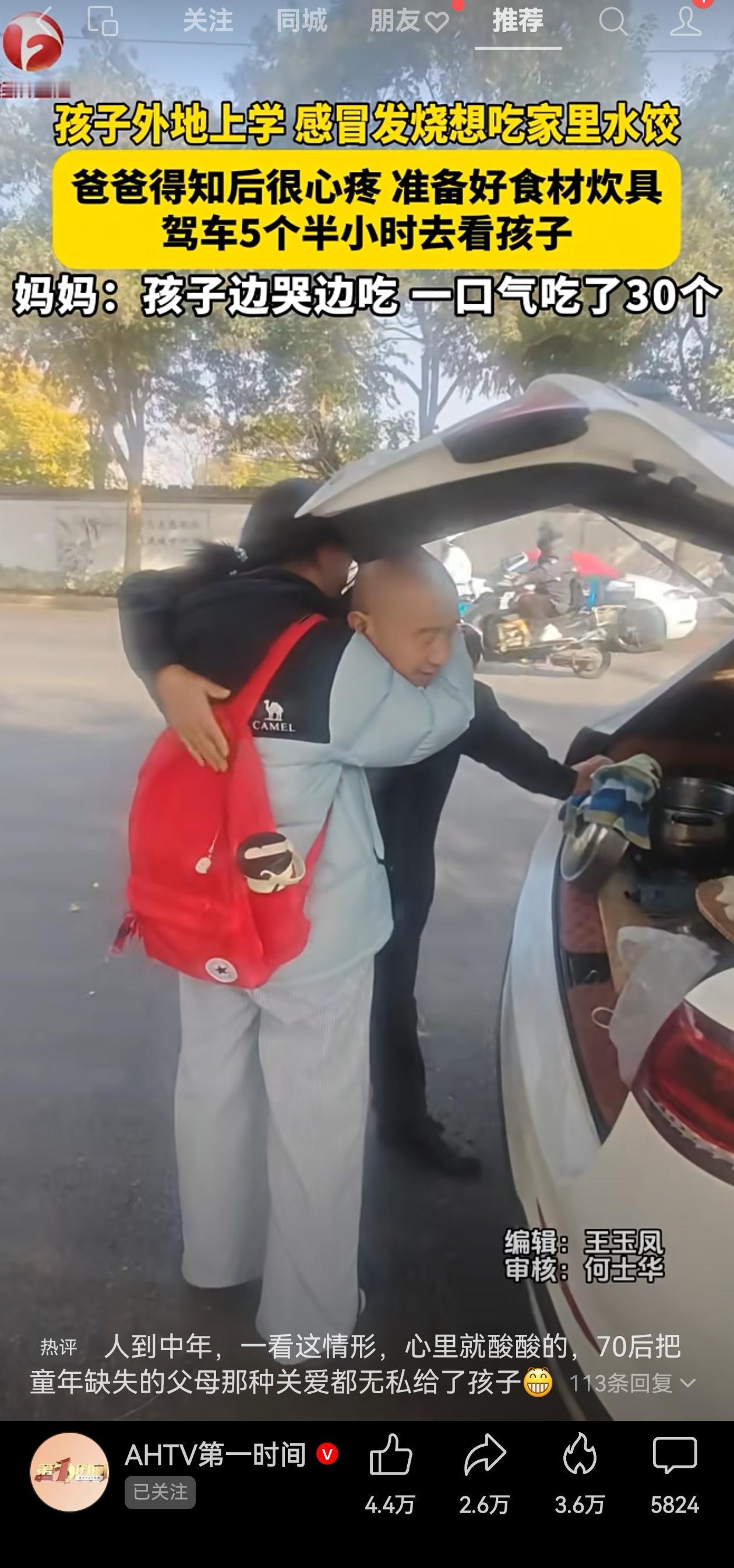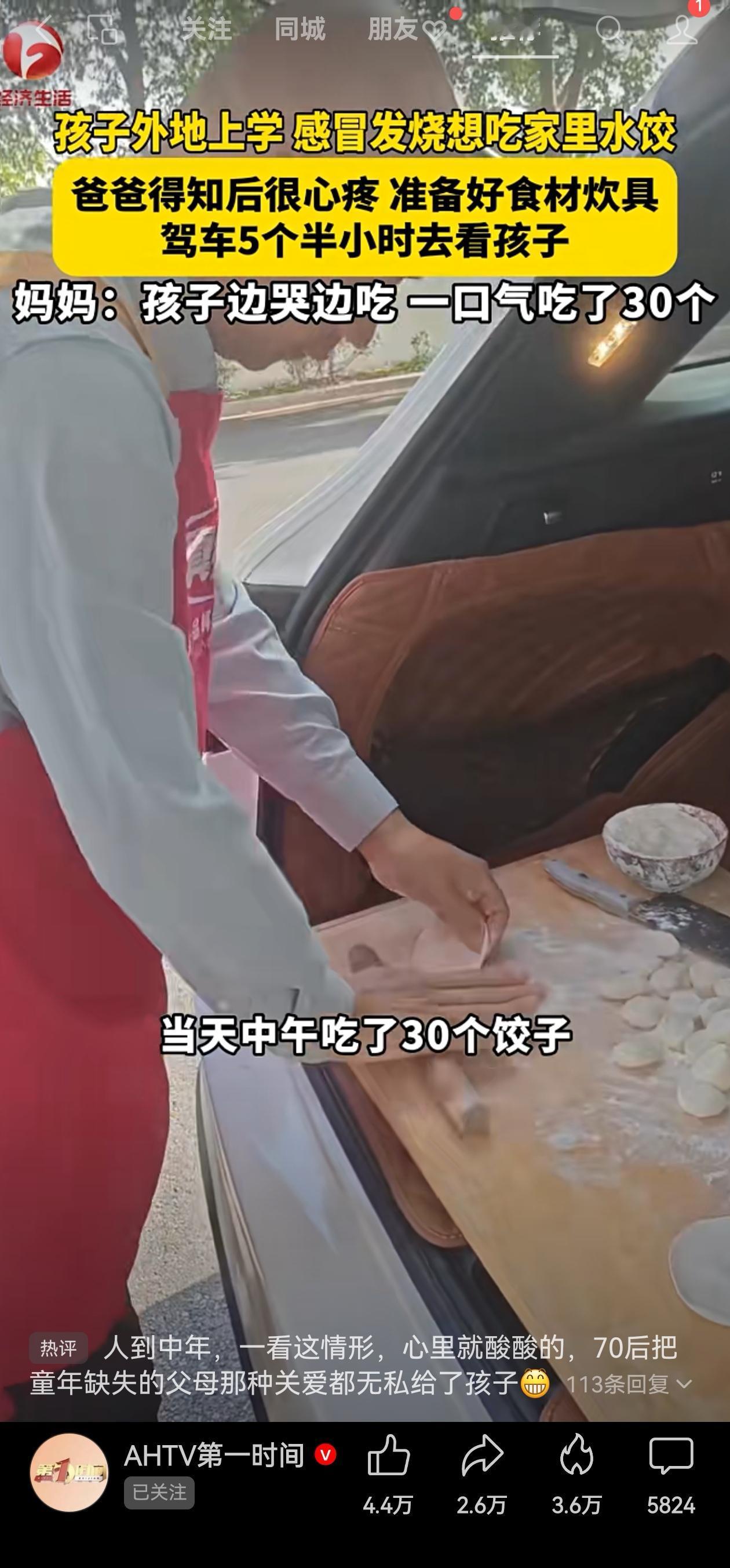 本周最幸福闺女!在南京读大学的女儿生病了,打电话回家说“想吃家里的水饺”,当爹的一听,心里哪还搁得下? 整晚没睡踏实,天没亮就揣上馅儿、面团、小锅小灶,凌晨5点就摸黑出发开车上路了。 几百公里,老父亲中间就在一个服务区休息了10分钟。开了五个半小时,直奔到孩子学校,早上10点到的学校,找个地方打开后备箱就开始和面、包饺子、煮饺子。 女儿埋头一口接一口地吃,眼泪吧嗒吧嗒往下掉,“就是这个味儿”!一口气吃了三十个! 这就是老父亲啊!平常在家可能话不多,可闺女一有动静,立马就变成了“超人”。 心里就揣着一个最朴素的念头:得让女儿吃上口热的,想吃的! 赶了几百公里给闺女做“家的味道”,分明是把家,把一颗踏实暖热的心,直接揣过来,安放在了孩子面前。 这条视频好多人看得眼圈发酸,有条评论被顶得老高:“人到中年,一看这情形,心里就酸酸的,70后把童年缺失的父母那种关爱都无私给了孩子”! 在生病想家、最脆弱的时候,爸爸带着家的味道和温度,穿越几百公里直接“空投”到你面前,难道不是最大的安慰吗? 闺女边哭边大口吃完,明明白白是被无条件宠着,这种爱可是千金不换啊! 真是,羡慕哭了…… 信息来源:AHTV第一时间
