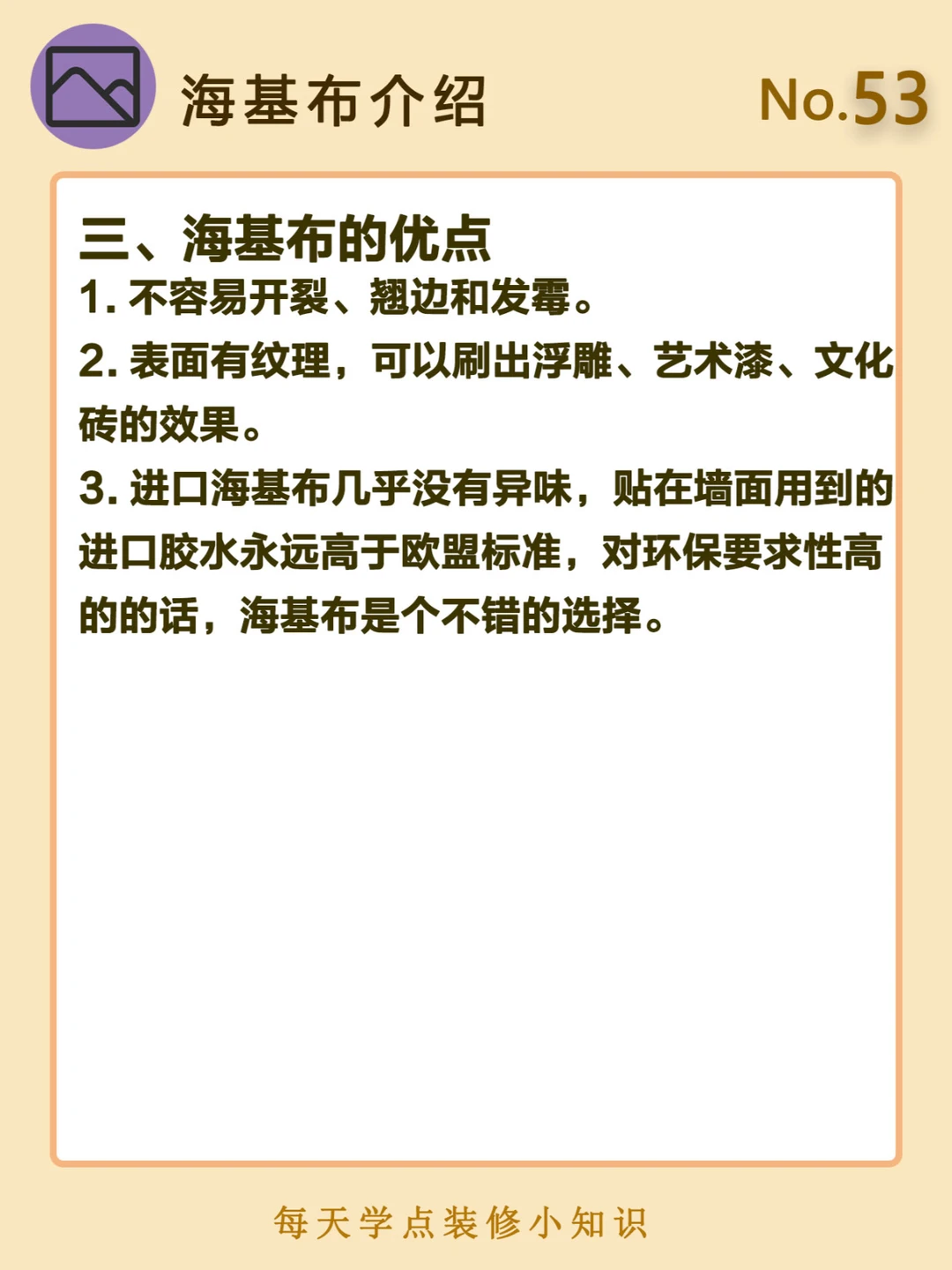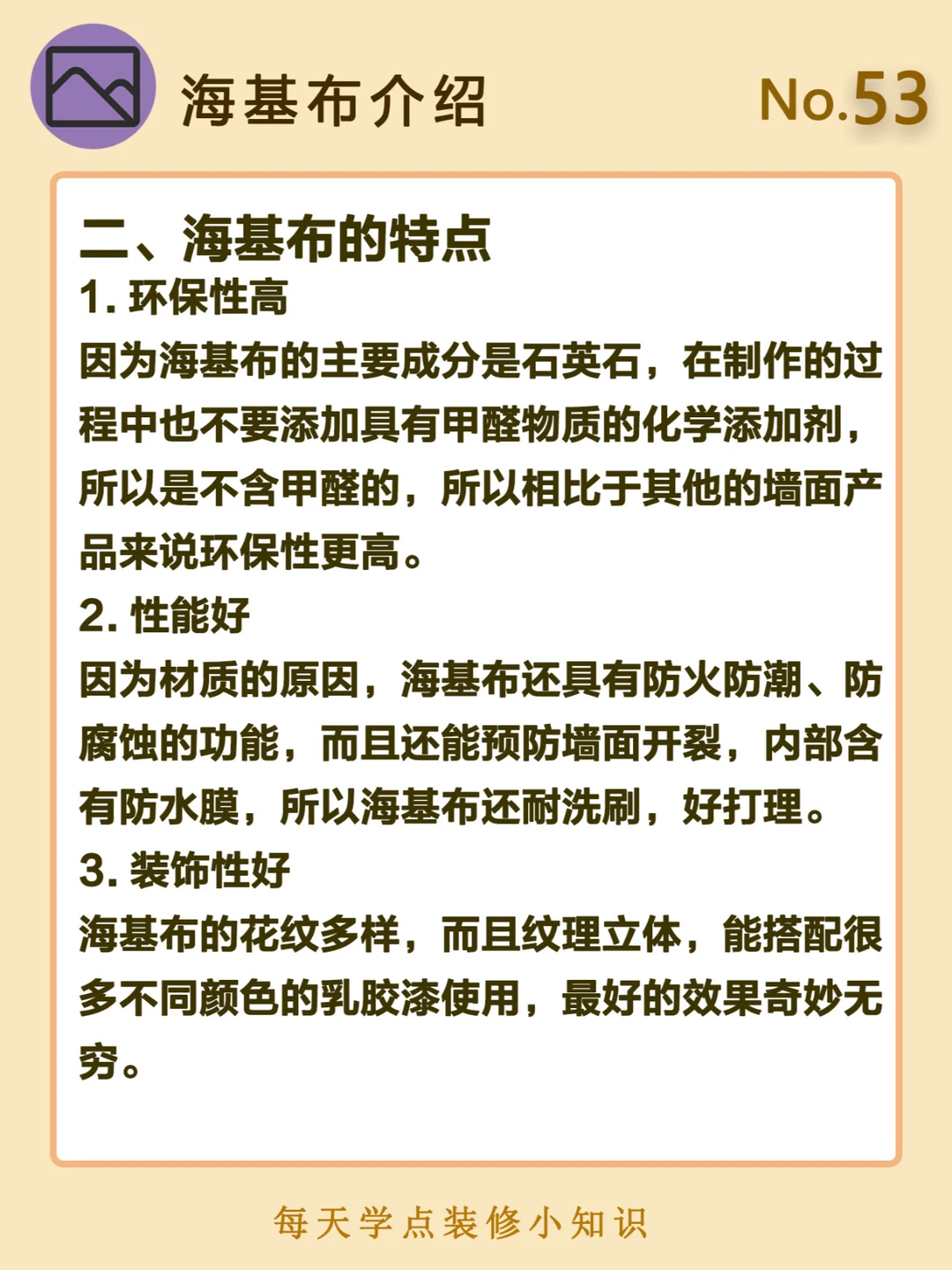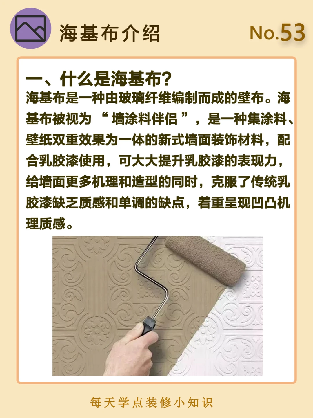 海基布是一种由玻璃纤维编制而成的壁布。海基布被视为“墙涂料伴侣”,是一种集涂料、壁纸双重效果为一体的新式墙面装饰材料,配合乳胶漆使用,可大大提升乳胶漆的表现力,给墙面更多机理和造型的同时,克服了传统乳胶漆缺乏质感和单调的缺点,着重呈现凹凸机理质感。