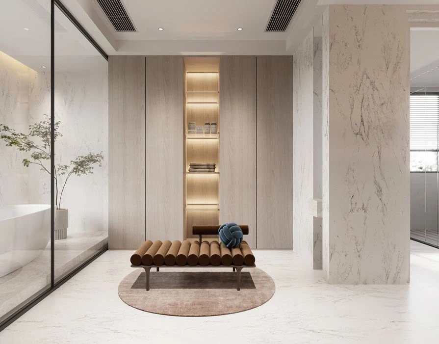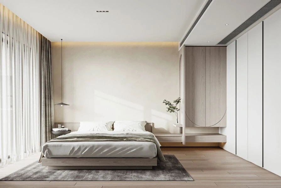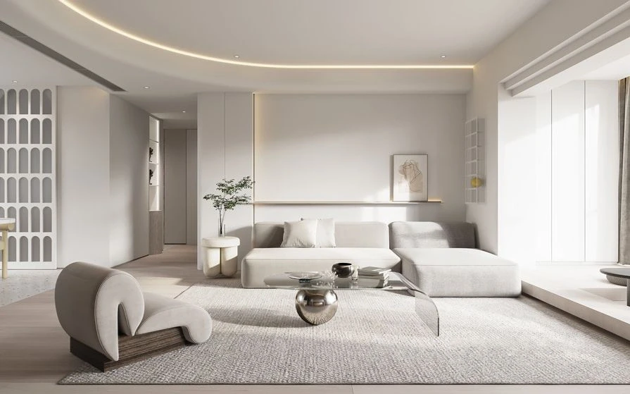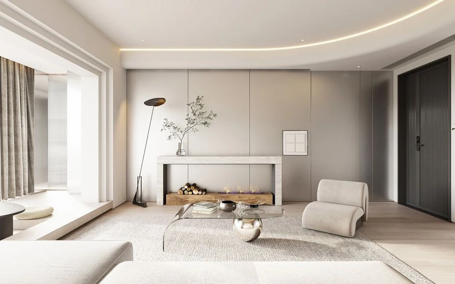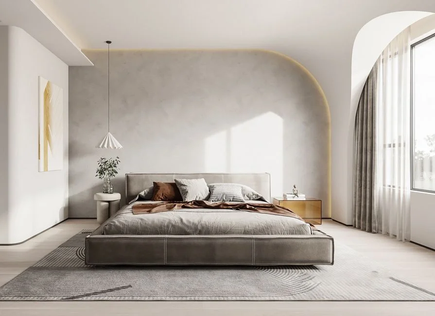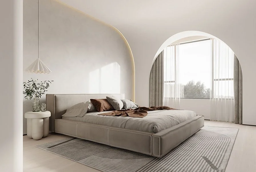 🌿全屋以淡奶油色为主基调,简约吊顶拉伸空间层高,设计简单却有着属于自己的独特风格。干净简约的纯色背景墙只用一副装饰画在角落做点缀,在软装上柔软的科技布沙发+创意玻璃异形茶几格调满满。同时选择无主灯+灯带的设计美观大方,新颖而富有韵律。 🌿电视背景墙也没有做过多的设计,实木护墙板美观大方,舍去电视机的位置留出空隙,可以放上自己喜欢的绿植,氛围感满满~ 🌿阳台与客厅打通做了榻榻米的设计,整个视野变得开阔,增加了其使用功能,同时增多了日常活动空间,变得更加方便。 🌿客餐厅一体化的设计,通过地砖的改变悄悄的做了隔断的处理。纯色背景墙干净通透,玻璃收纳柜即美观又实用。中岛长餐桌,即是吧台也是工作台,功能性满满~ 🌿卧室依旧采用暖暖的奶油色为主色调,纯色背景墙面干净利落,定制的通顶衣柜+床头满足了日常的收纳需求,落地窗帘的高度把握的恰到好处常舒适休息空间~ 🌿次卧延续了整个空间的主色调,但是别出心裁的做了拱形门元素来赋予窗的呈现,让整个空间不再显得单调、沉闷,在一定程度上利用这个设计改善了层高高度。 🌿浴室选择了干湿分离的设计,奶油色的浴室柜满足了收纳需求,同时摆放了一个实木沙发凳,累了的时候还能在这里休息,舒服~