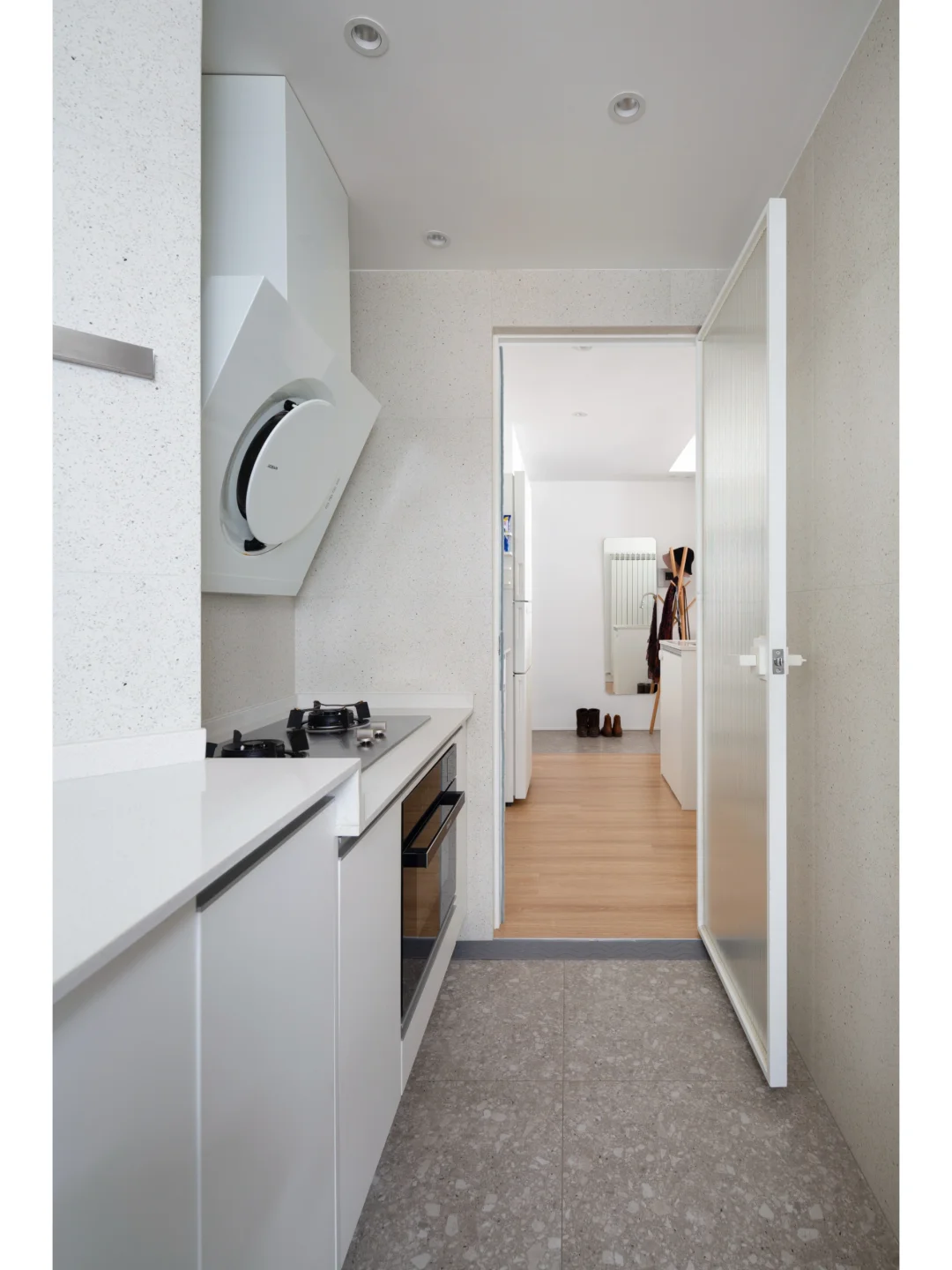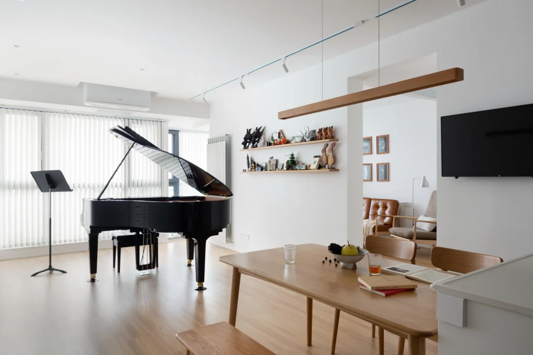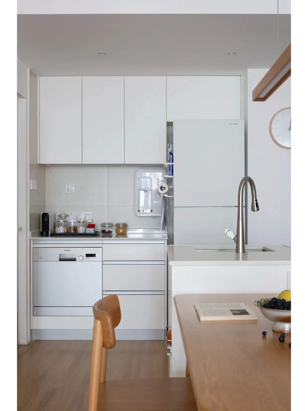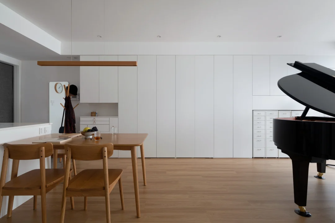 🌹入户、餐厅、厨房整合:入户进来两条动线,一条通往厨房,一条直达琴房;将原来的生活阳台改为厨房,一部分(洗碗等)功能外置,缓解内厨压力;在岛台处装水槽,方便在外厨进行简单的清洗。