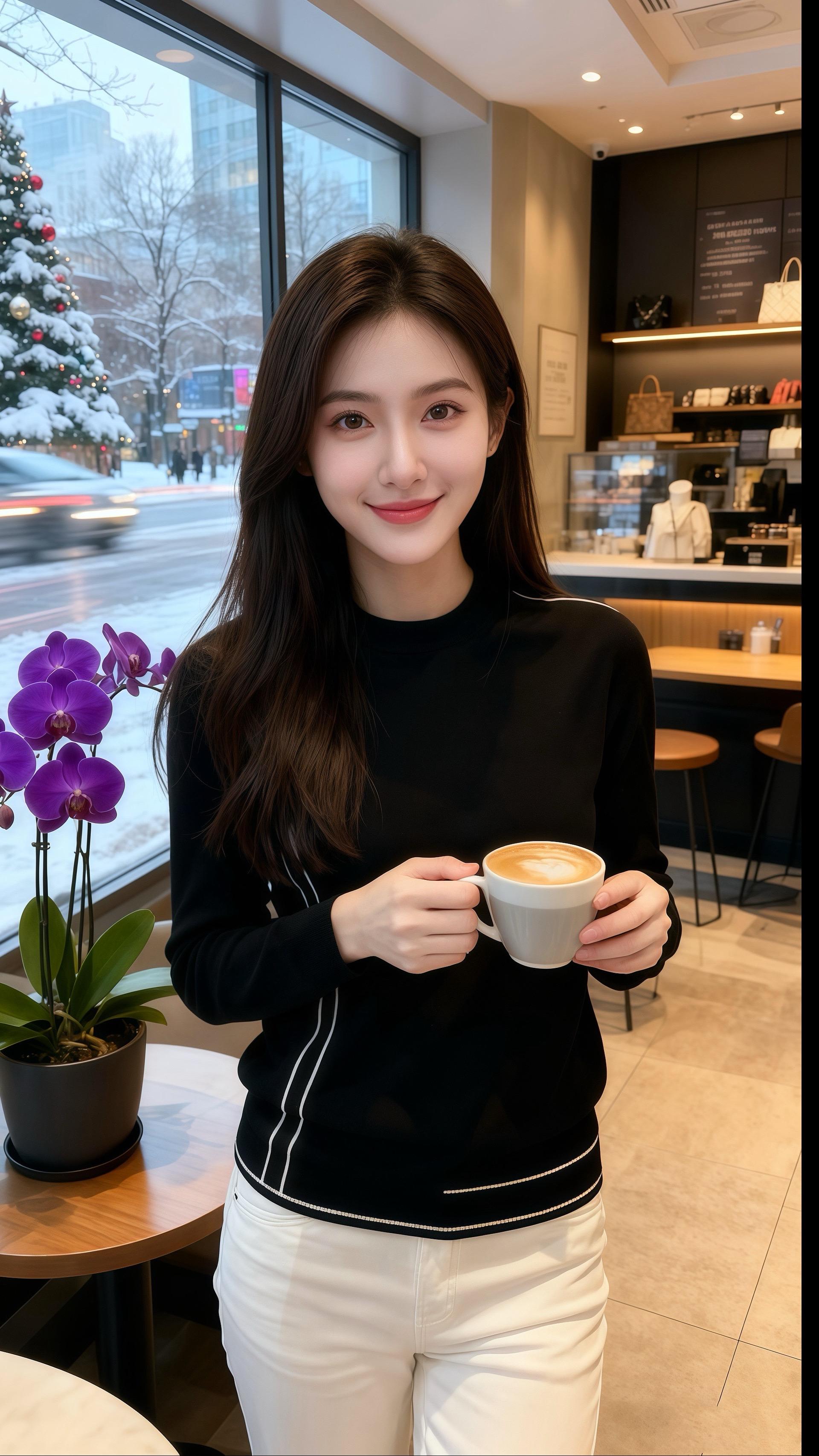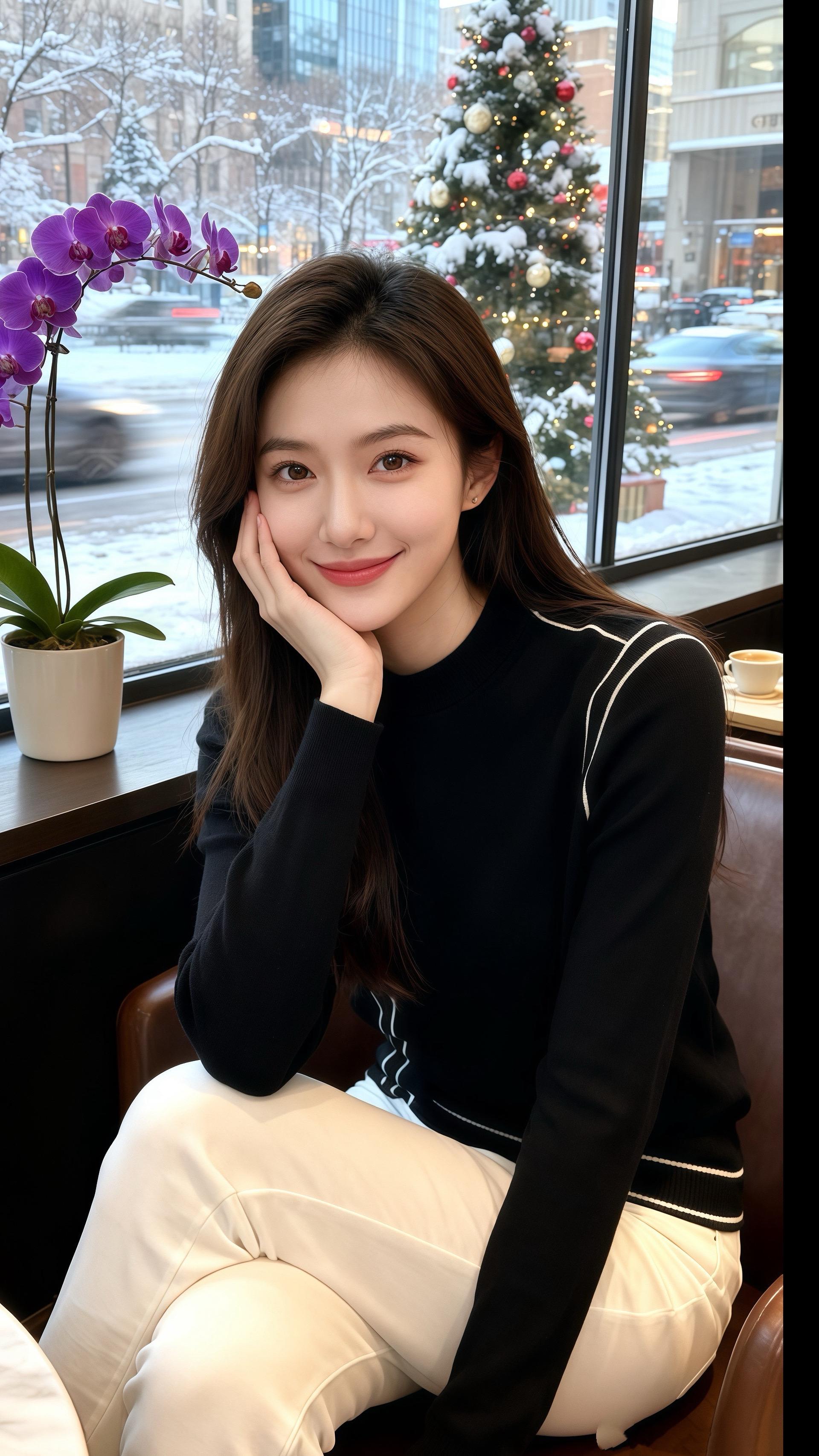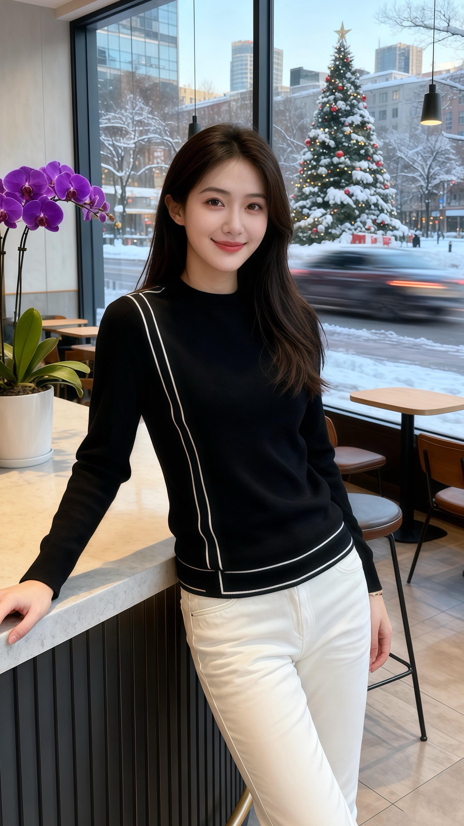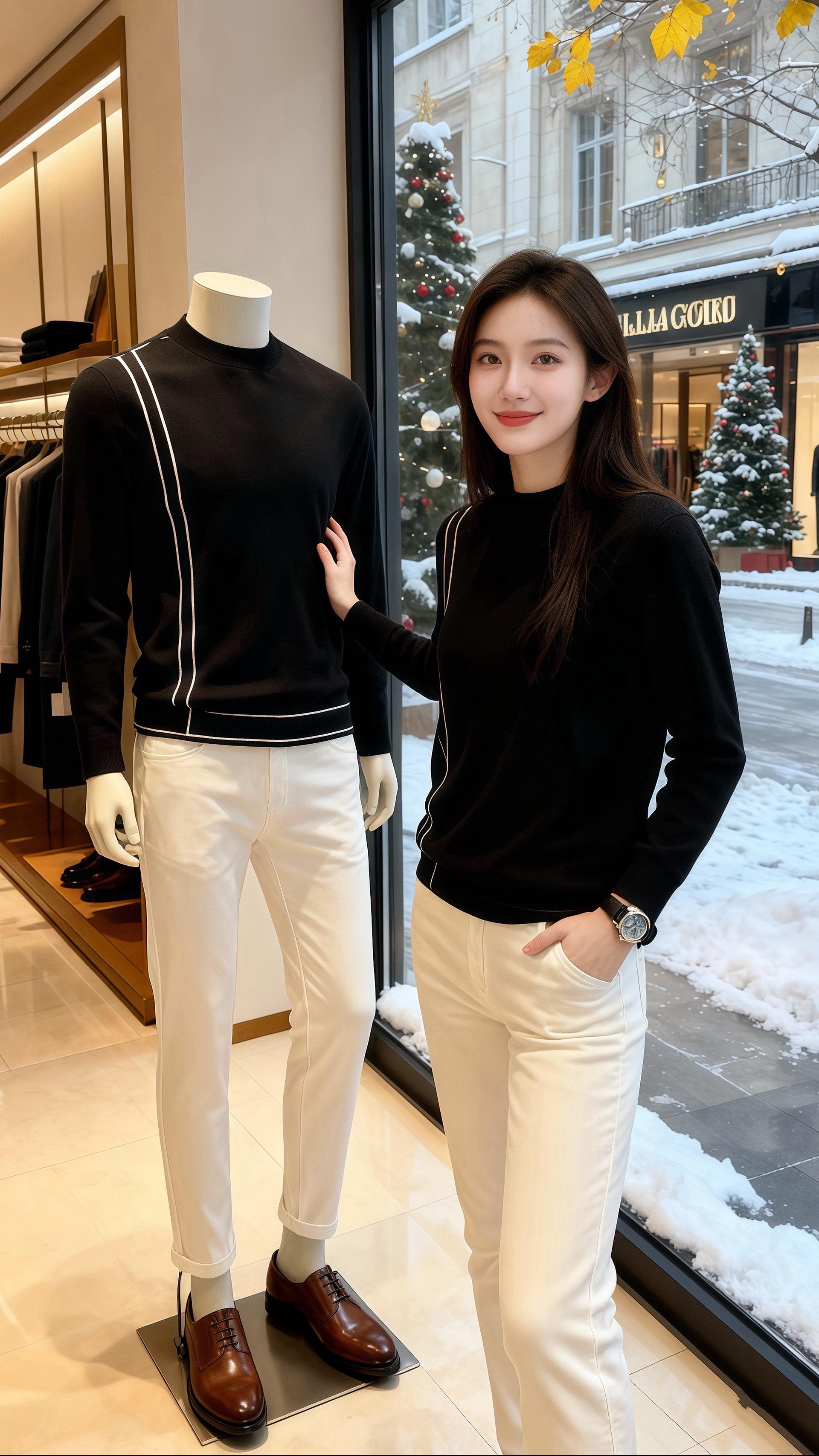 她穿的黑色针织衫缀着细白线条,简约的设计衬得肩颈线条格外好看,搭配米白色的休闲裤,黑白配色干净又温柔,像雪地里融了一缕暖光。领口的半高领设计刚好护住脖颈,袖口贴合却不紧绷,走动时衣摆的线条随着动作轻轻晃,把慵懒的氛围感拉满。