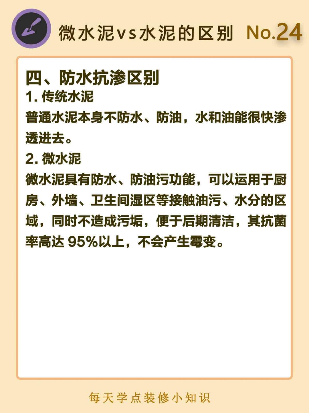 微水泥:微水泥具有防水、防油污功能,可以运用于厨房、外墙、卫生间湿区等接触油污、水分的区域,同时不造成污垢,便于后期清洁,其抗菌率高达95%以上,不会产生霉变。