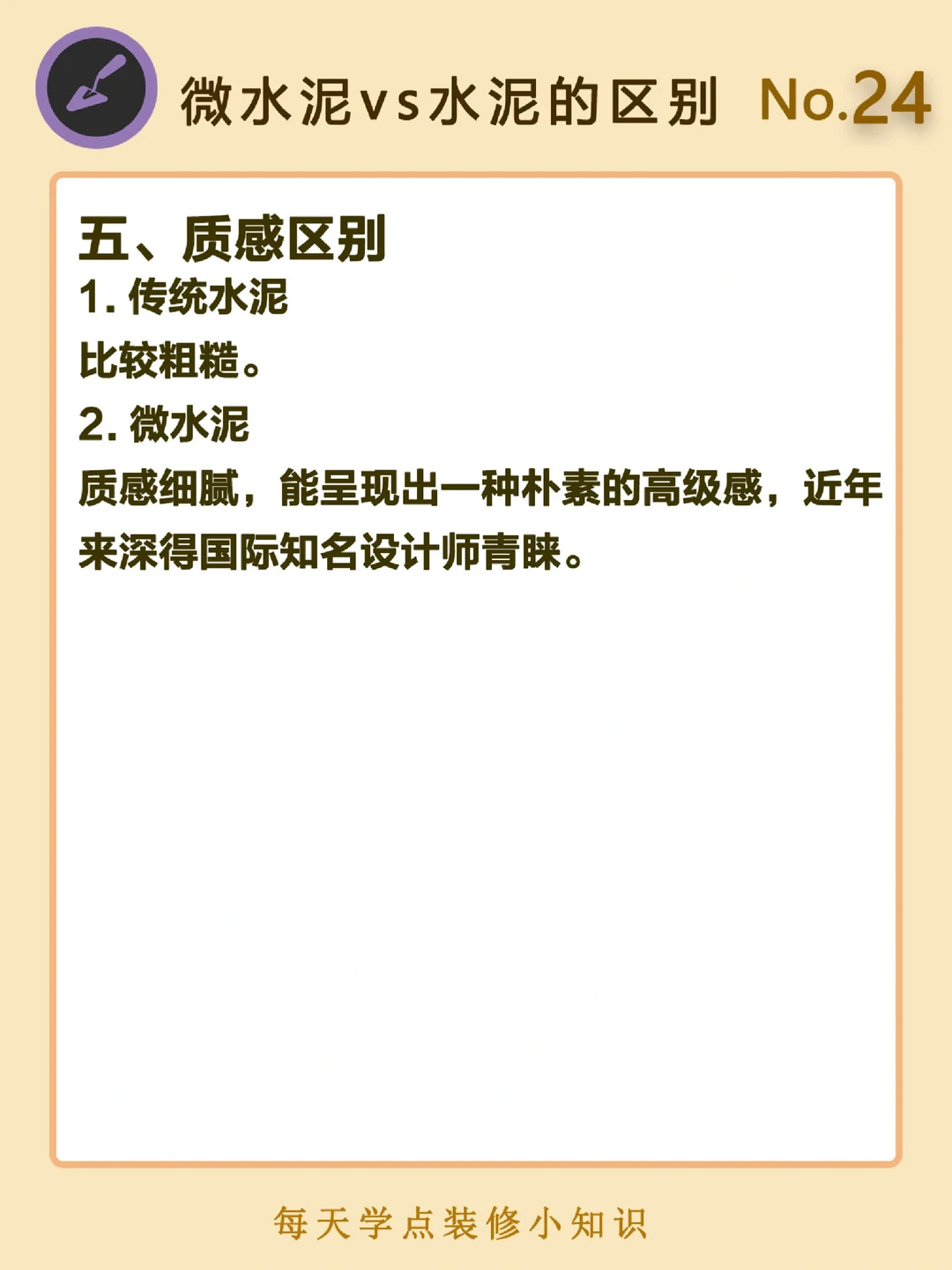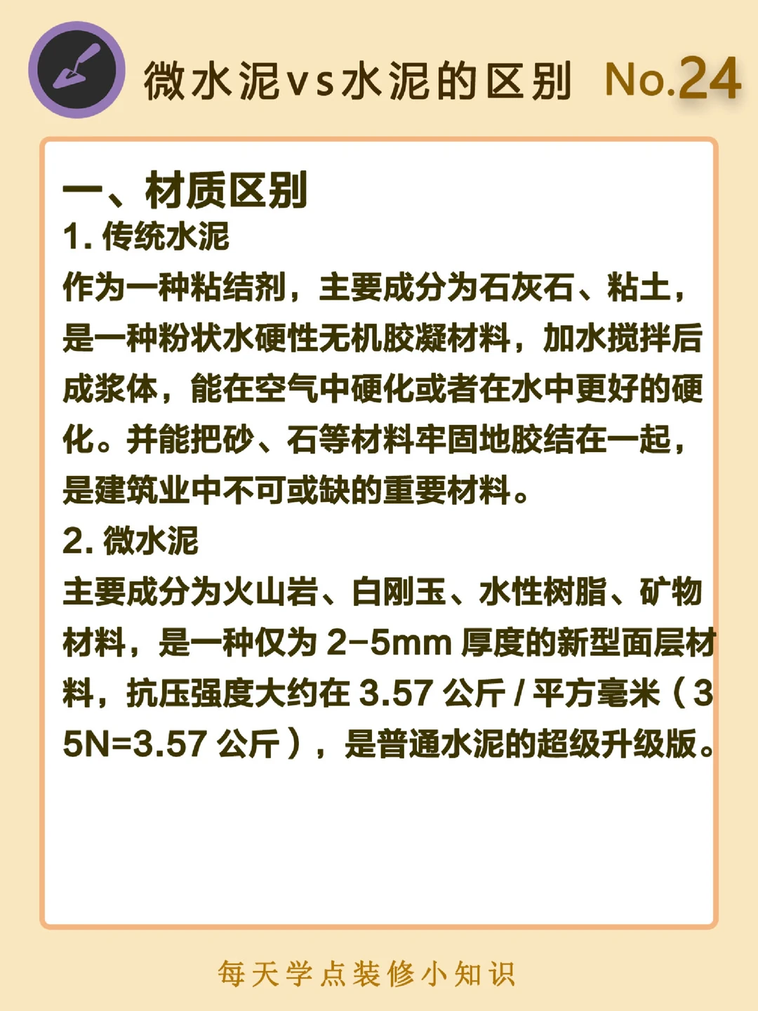 微水泥:主要成分为火山岩、白刚玉、水性树脂、矿物材料,是一种仅为2-5mm厚度的新型面层材料,抗压强度大约在3.57公斤/平方毫米(35N=3.57公斤),是普通水泥的超级升级版。