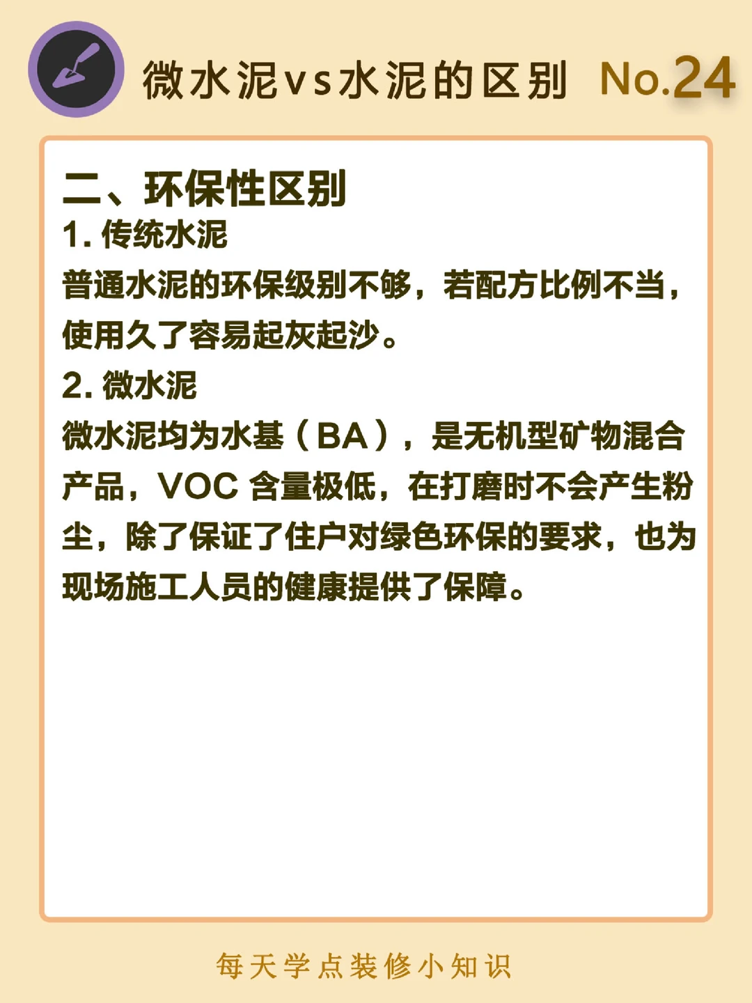 微水泥:微水泥均为水基(BA),是无机型矿物混合产品,VOC 含量极低,在打磨时不会产生粉尘,除了保证了住户对绿色环保的要求,也为现场施工人员的健康提供了保障;