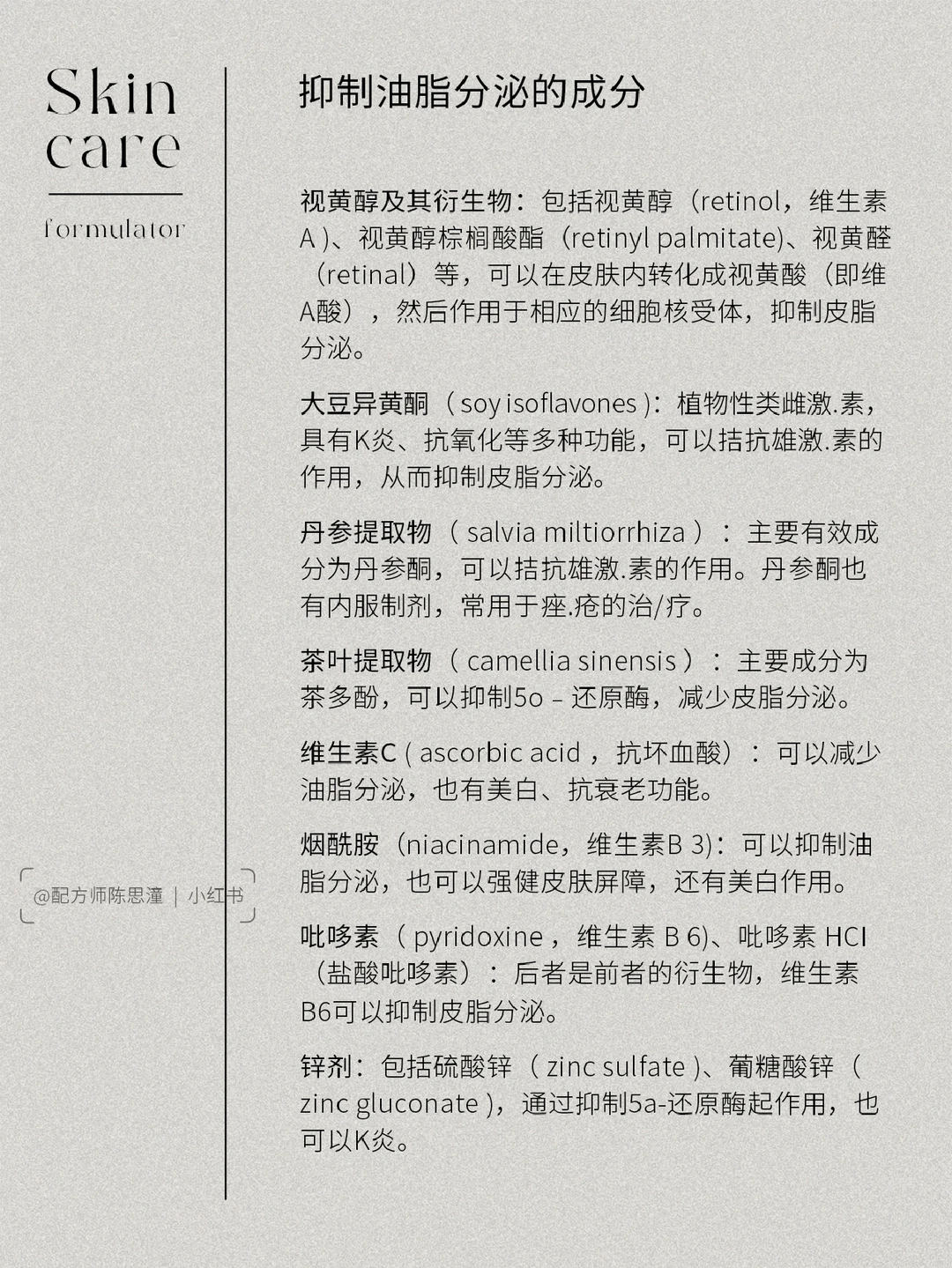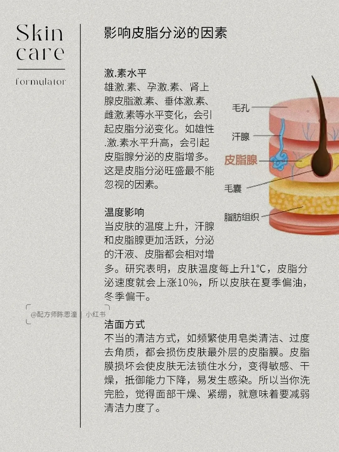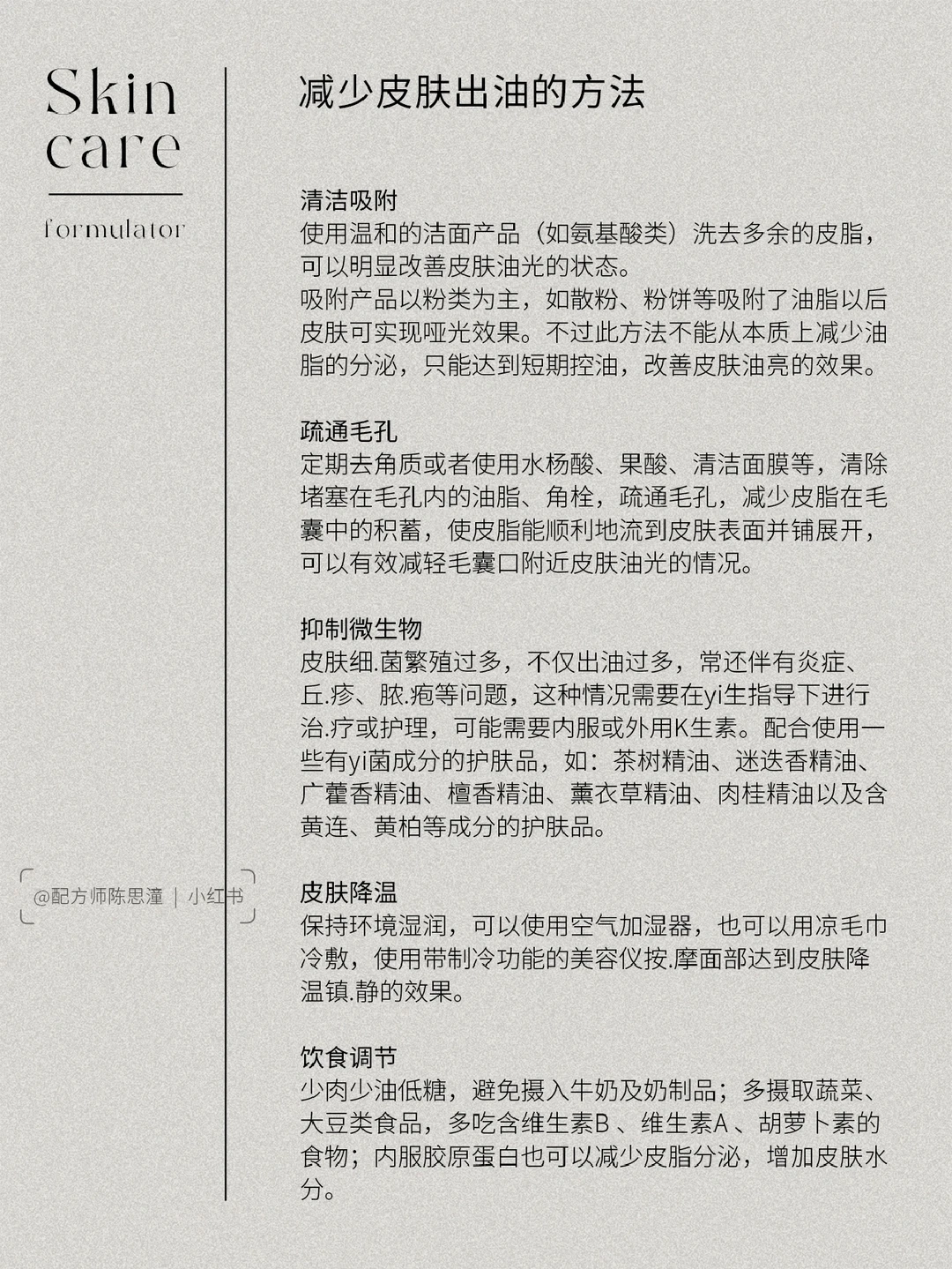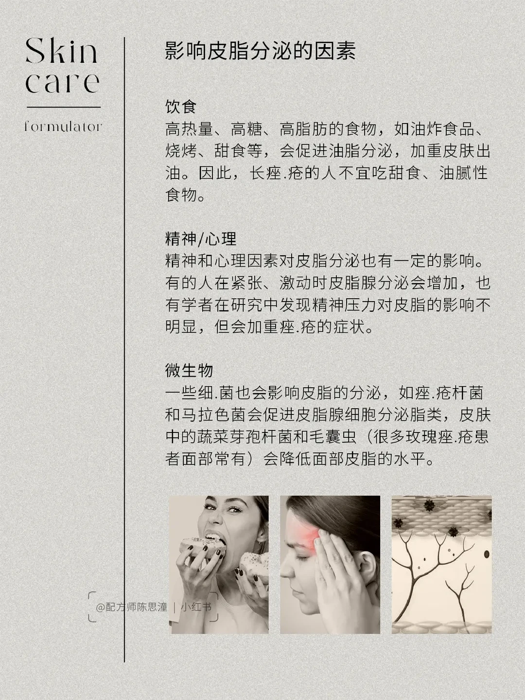 • 皮肤出油的原因 • 皮脂的成分和作用 • 影响皮脂分泌的因素 • 为什么越控油越油 • 减少皮肤出油的方法 • 抑制油脂分泌的成分 一起来了解一下吧,下期还想看什么可以❤➕🍎告诉我哦