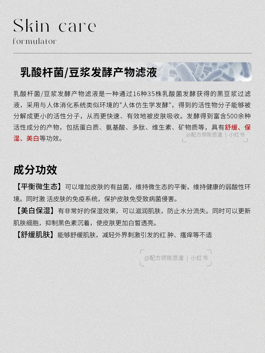 我们熟知的二裂酵母、乳酸杆菌等都是发酵产物,大 牌的相关产品中也使用了发酵类成分。发酵护肤品为消费者打造了更高 效的护肤体验,满足肌肤在营养与修复上的多元需求,还大大的提升滋养、保湿、抗衰等功效。一起来关注了解一下吧,下期还想看什么可以❤➕🍎告诉我哦 配方师眼中的成分 护肤小知识 配方师 发酵护肤公开课 发酵护肤 二裂酵母 抗衰逆龄