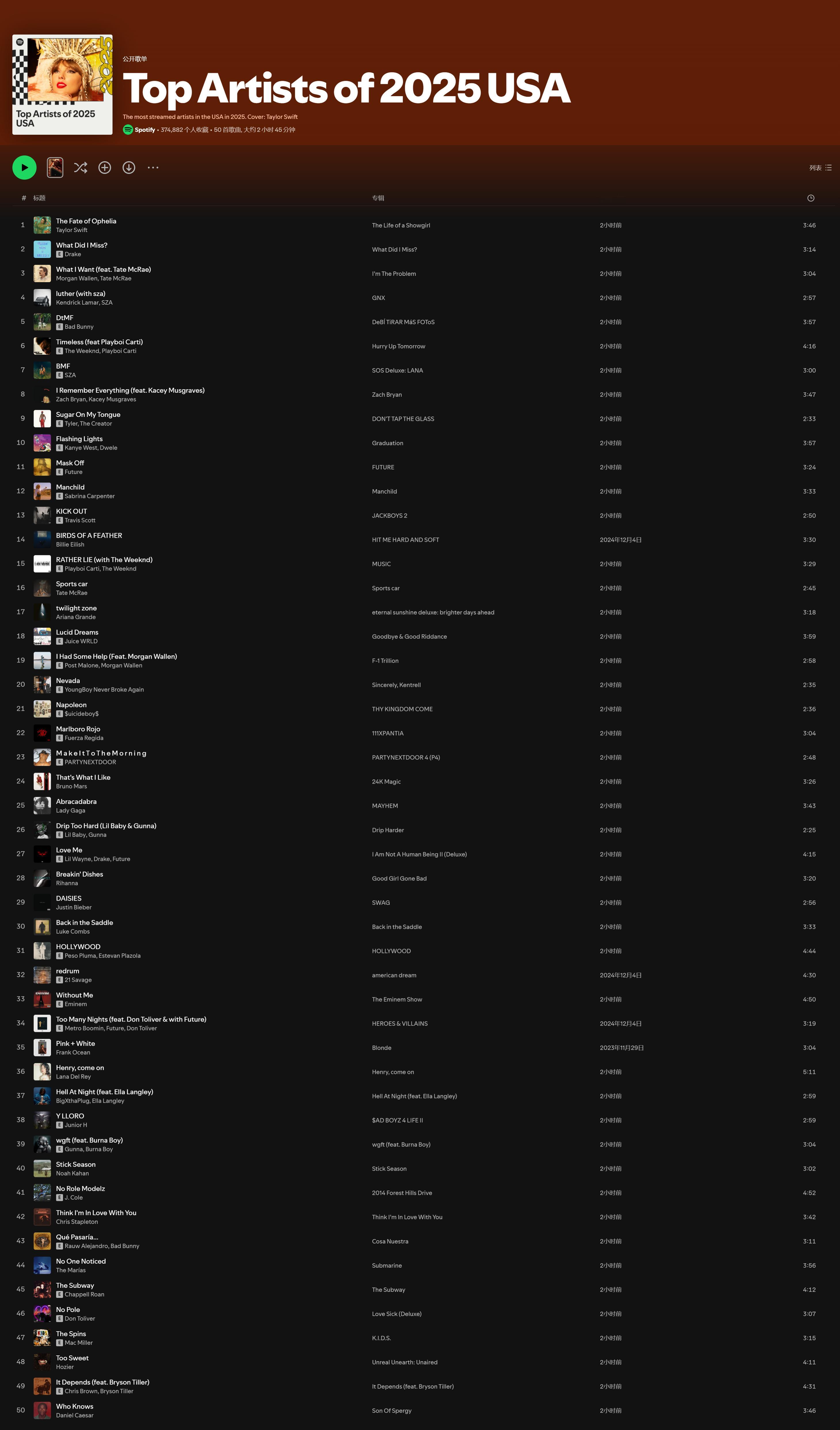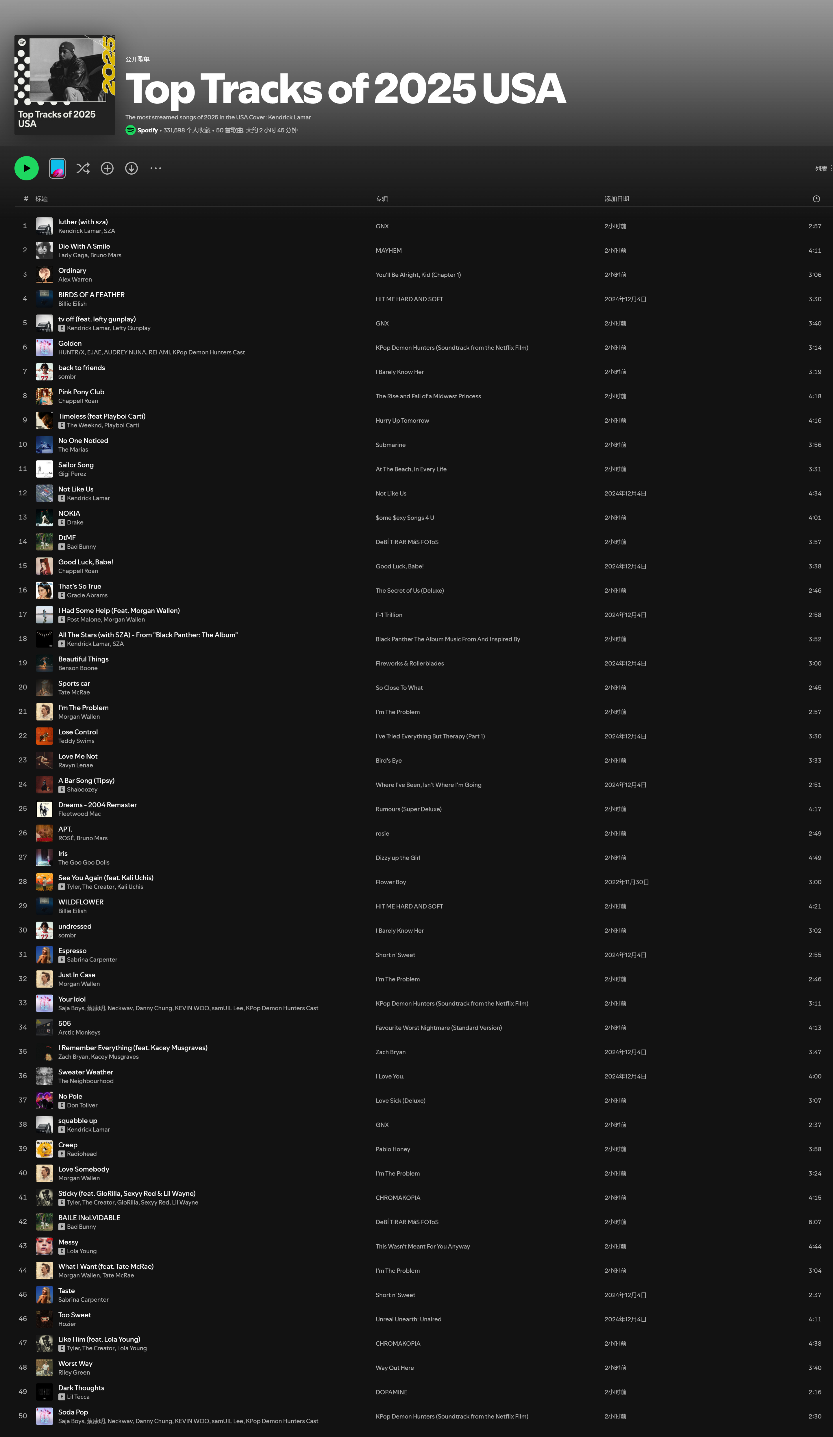 Spotify公布2025年美国年度50佳艺人、专辑和歌曲年终榜!来看你喜欢的歌手上榜了吗?!Spotify美国2025年度十佳专辑:1. I’m The Problem by Morgan Wallen2. SOS Deluxe: LANA by SZA3. DeBÍ TiRAR MáS FOToS by Bad Bunny4. KPop Demon Hunters (Soundtrack from the Netflix Film) by KPop Demon Hunters Cast, HUNTR/X, Saja Boys5. GNX by Kendrick Lamar6. Short n’ Sweet by Sabrina Carpenter7. So Close To What by Tate McRae 8. The Life of a Showgirl by Taylor Swift9. One Thing At A Time by Morgan Wallen10. HIT ME HARD AND SOFT by Billie EilishSpotify美国2025年度十佳歌曲:1. “luther (with sza)” by Kendrick Lamar and SZA2. “Die With A Smile” by Lady Gaga and Bruno Mars3. “Ordinary” by Alex Warren4. “BIRDS OF A FEATHER” by Billie Eilish5. “tv off (feat. lefty gunplay)” by Kendrick Lamar and Lefty Gunplay6. “Golden” by HUNTR/X, EJAE, AUDREY NUNA, REI AMI, KPop Demon Hunters Cast7. “back to friends” by sombr8. “Pink Pony Club” by Chappell Roan9. “Timeless (feat. Playboi Carti)” by The Weeknd and Playboi Carti10. “No One Noticed” by The MaríasSpotify美国2025年度十佳歌手:1. Taylor Swift2. Drake3. Morgan Wallen4. Kendrick Lamar5. Bad Bunny6. The Weeknd7. SZA8. Zach Bryan9. Tyler, The Creator10. Kanye West