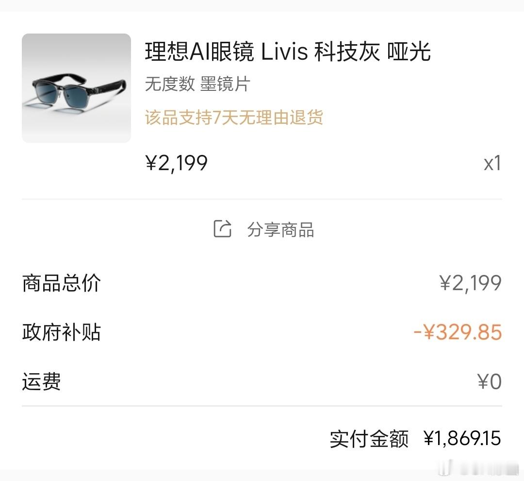 趁着账号里还有台理想,买个理想AI眼镜玩玩原来墨镜版也有补贴,1800多,蔡司镜
