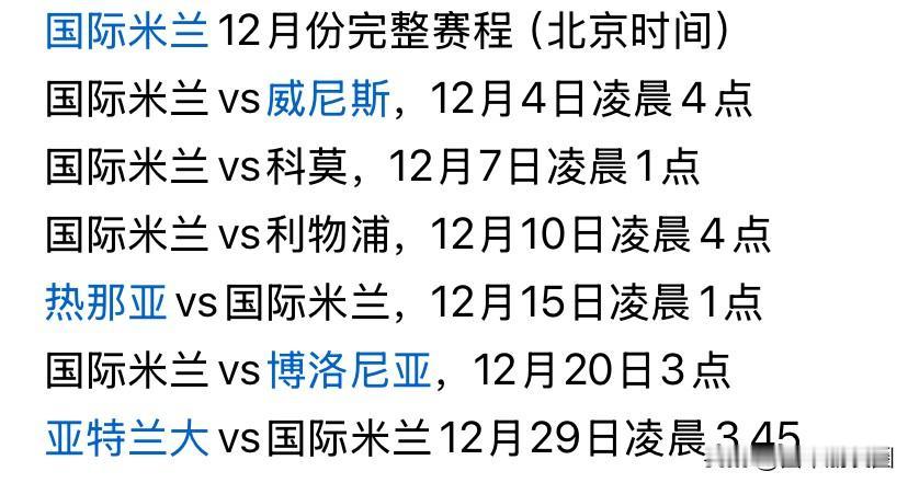 12月征程,事关出线和奖杯!国际米兰12月赛程出炉,合计6场赛事(最多7场,若意超杯进决赛将增加一场)。 纵观整个赛程,重中之重无疑是主场与利物浦的欧冠对决,这场事关欧冠直通出线,直接与钱挂钩。当然3场意甲赛事也不可掉以轻心,毕竟现在联赛积分榜前四仅仅相差1分,一不小心就有可能被拉大差距。意超杯则是国际米兰本赛季可争夺的第一个奖杯,希望能有收获。 加油,国际米兰!
