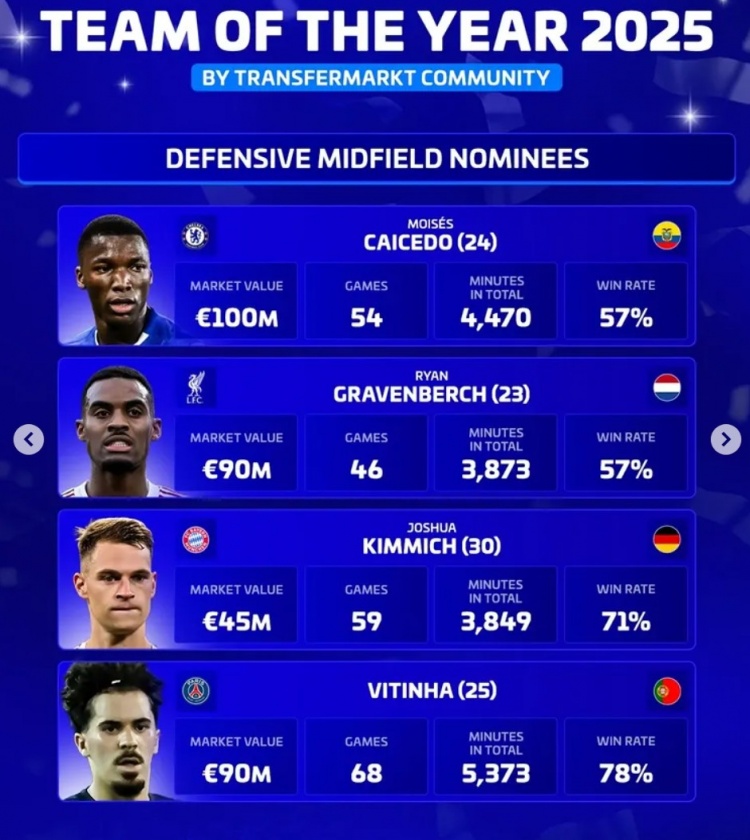 直播吧12月4日讯《转会市场》评选2025年最佳后腰(防守型中场),并列出了4人候选同时对比了他们的数据:
