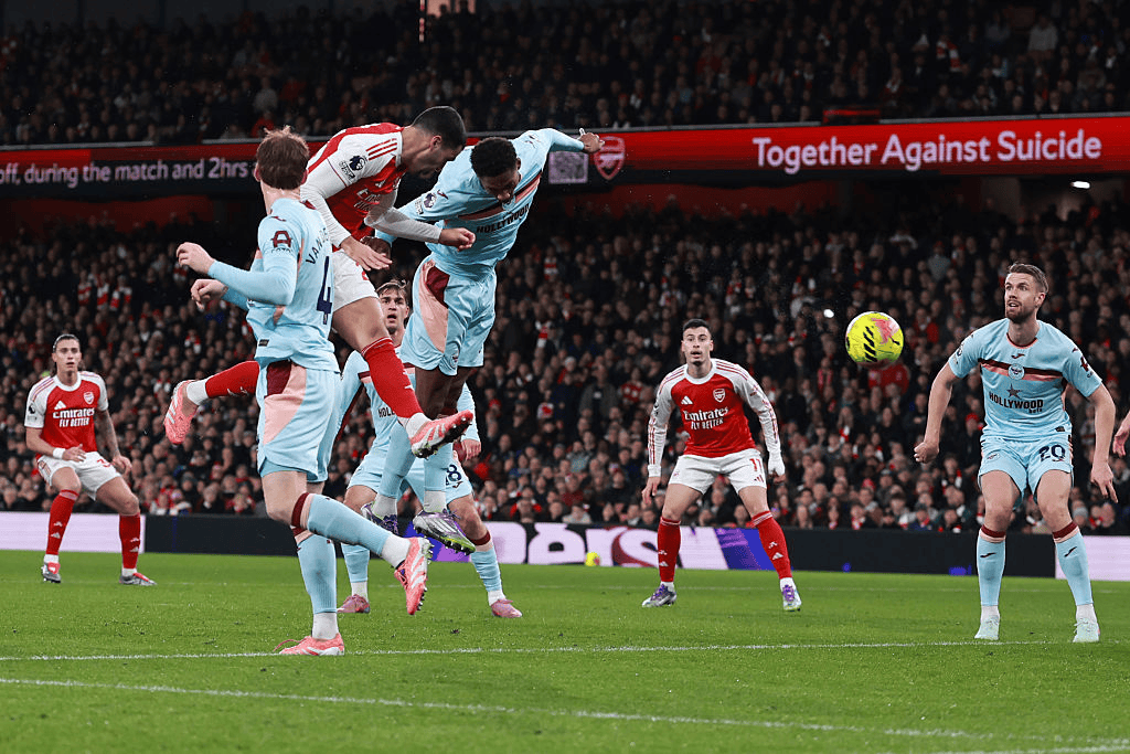 虎扑12月04日讯英超第14轮,阿森纳主场迎战布伦特福德,梅里诺在上半场接到本-怀特的传中球头球破门。