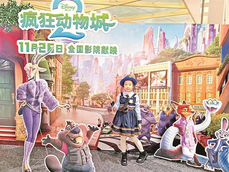 下午2点的大世界影城(大悦城店),完全没有工作日的冷清。大厅里,兔子朱迪、狐狸尼克的高立牌前挤满了拍照的大人、小孩,地面“破墙而出”的大象贴纸被踩得发亮;三位打扮精致的女生正对着“闪电”树懒模型模仿慢动作。“还以为来到贺岁档现场了!”刚挤进影厅的李先生晃了晃手里的主题套餐,可乐杯上的豹警官图案格外醒目。