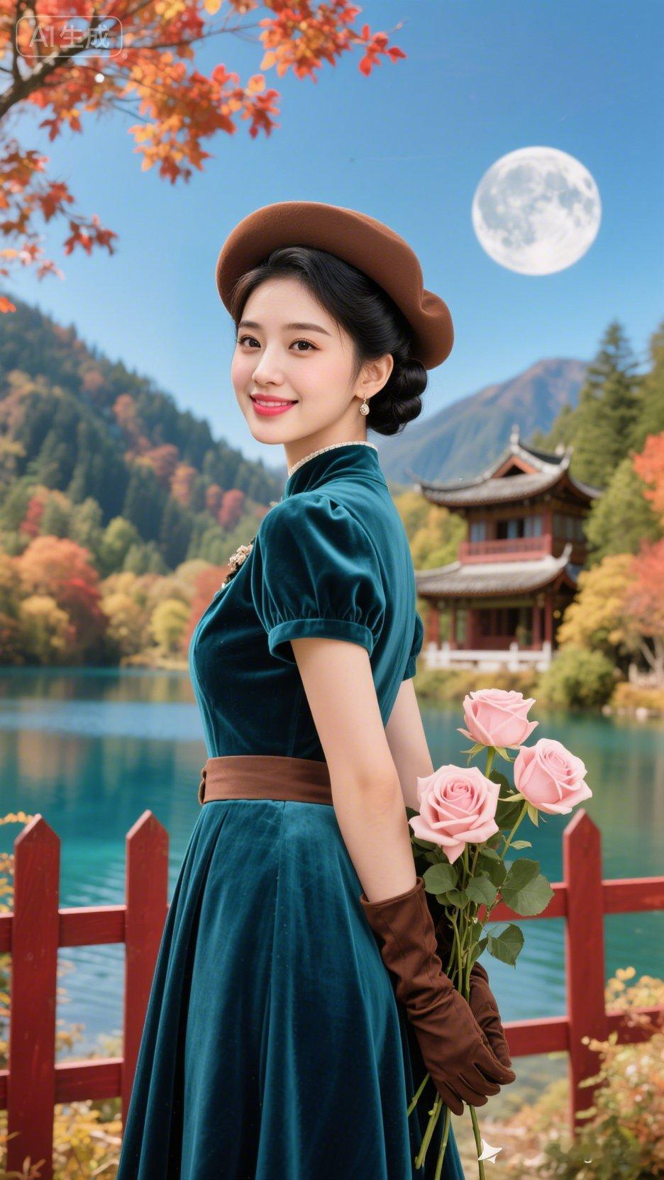 九寨沟熊猫海秋景里,红叶栅栏、蓝天与中式楼阁衬出复古优雅。