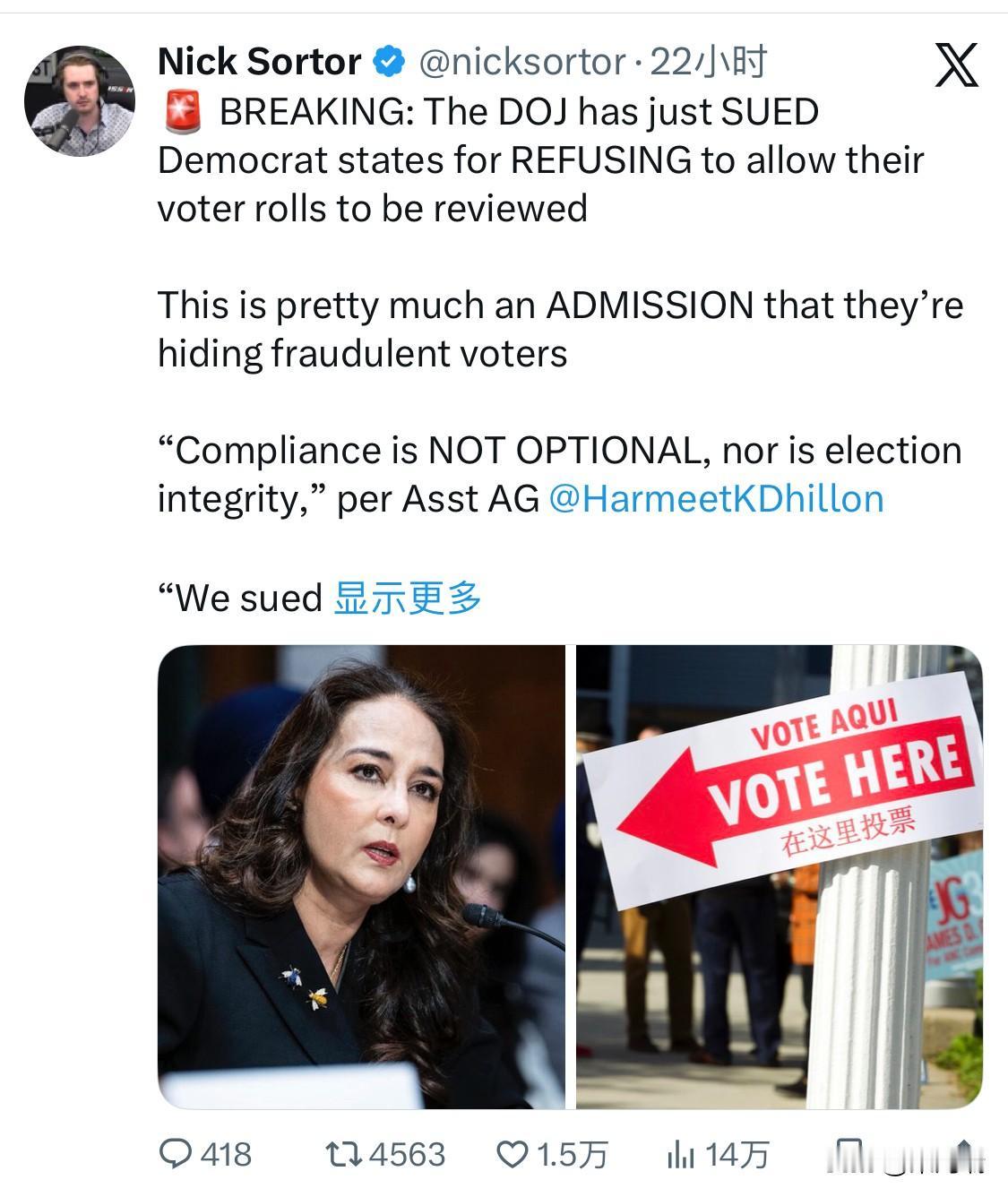 突发新闻:美国司法部刚刚起诉民主党执政的几个州,指控它们拒绝允许对其选民名册进行审查。 这几乎等于承认他们在包庇欺诈选民。 “遵守规定不是可选项,选举公正也不是可选项,”助理检察长哈米特·K·迪隆表示。 “我们起诉了特拉华州、马里兰州、新墨西哥州、罗德岛州、华盛顿州和佛蒙特州,因为它们未能遵守我们要求提供选举数据的规定。”