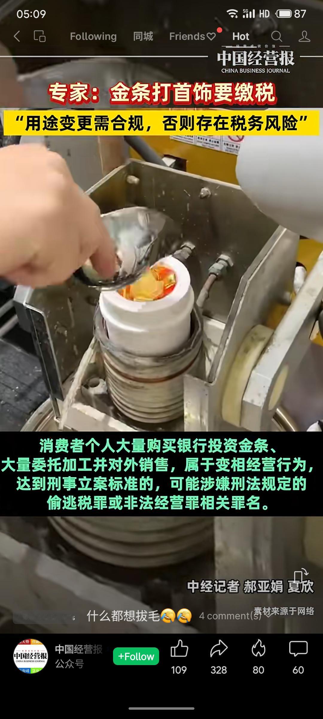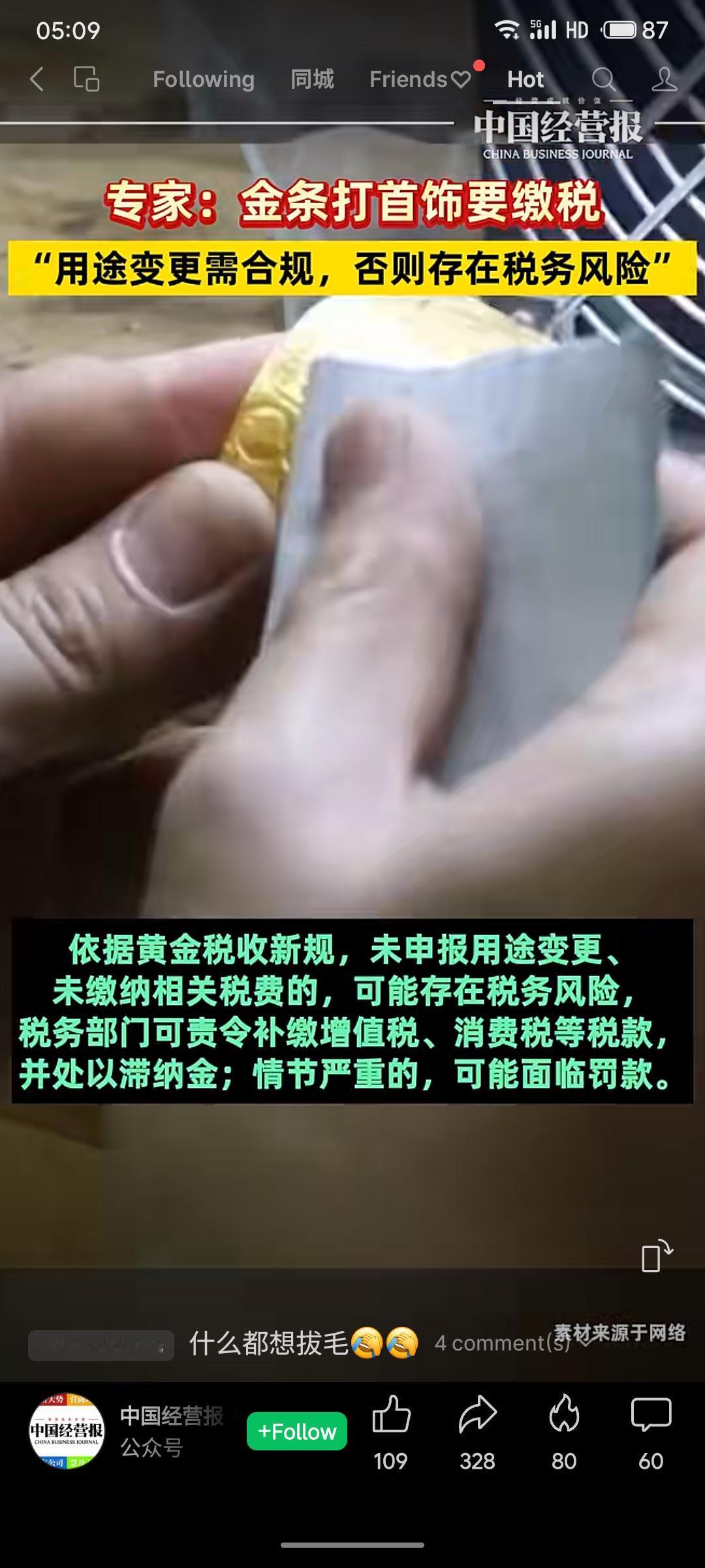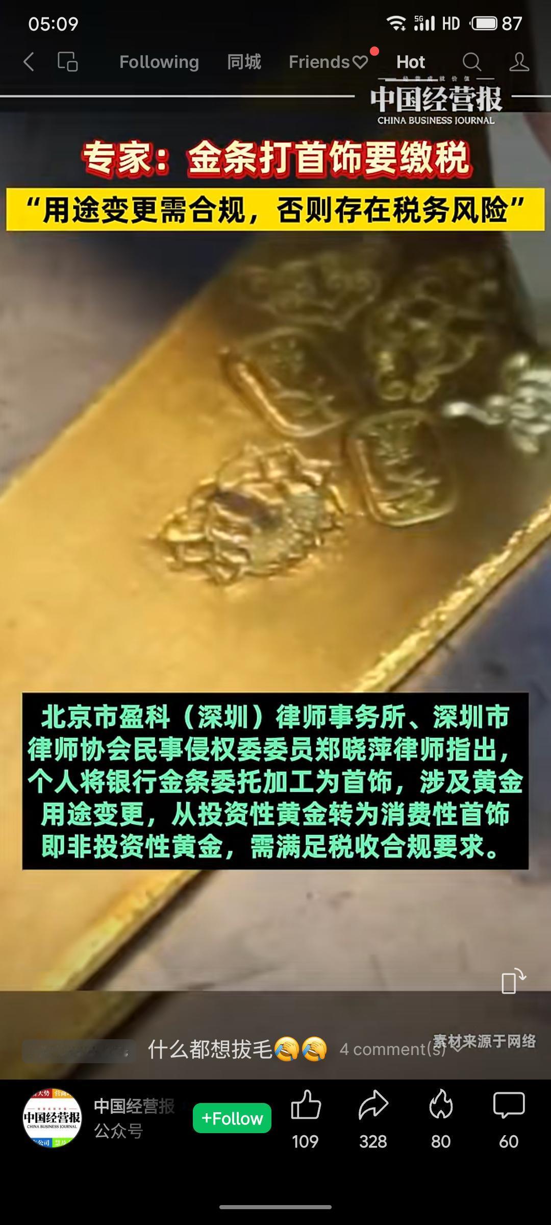 根据最新黄金税收政策,专家指出个人将银行金条委托加工为首饰,属于从投资性黄金转为消费用途,需依法缴纳增值税及消费税,否则面临补缴、滞纳金甚至罚款风险。但实际操作中,各地执行存在差异,有打金店表示并不缴税。政策本意为规范用途变更,防范变相经营与偷漏税,但也引发了公众对税收征管是否“过度”的讨论。