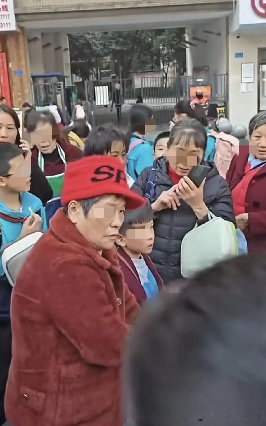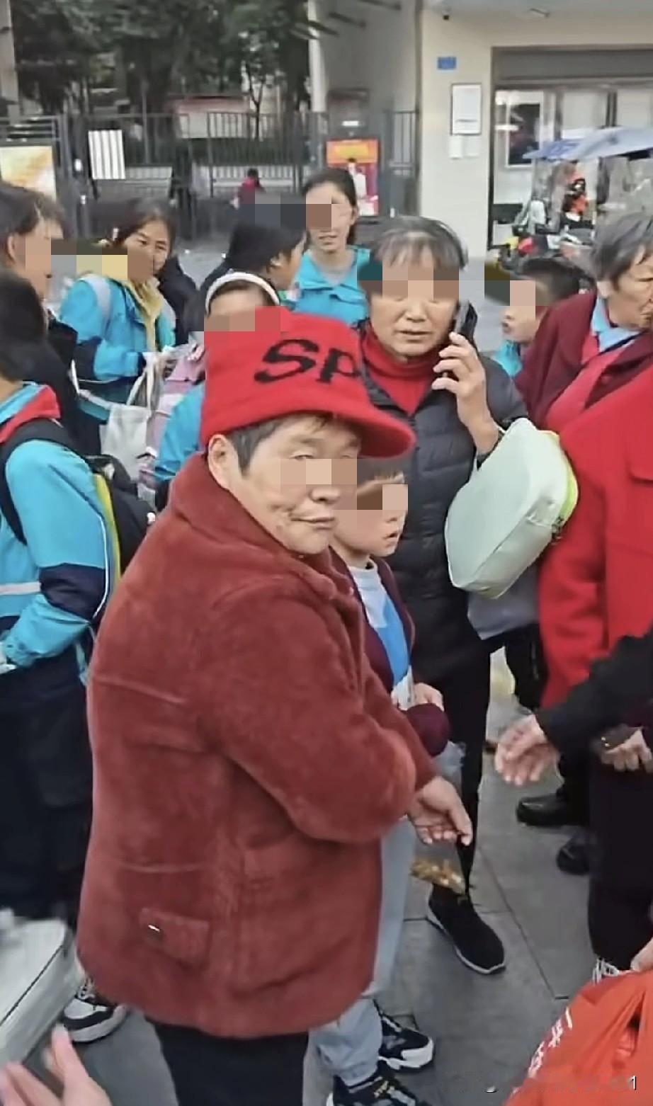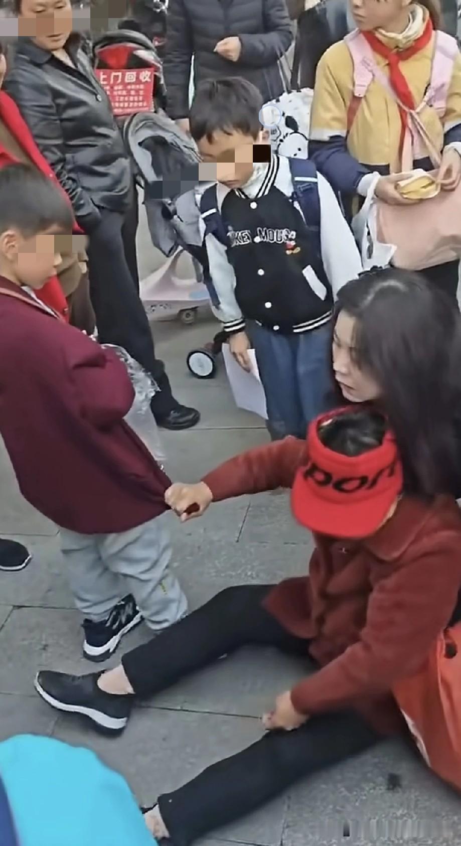 学校门口一位老奶奶坐在地上,双手紧紧揪住一名小学生的衣服,死活不让他走,坚称是被