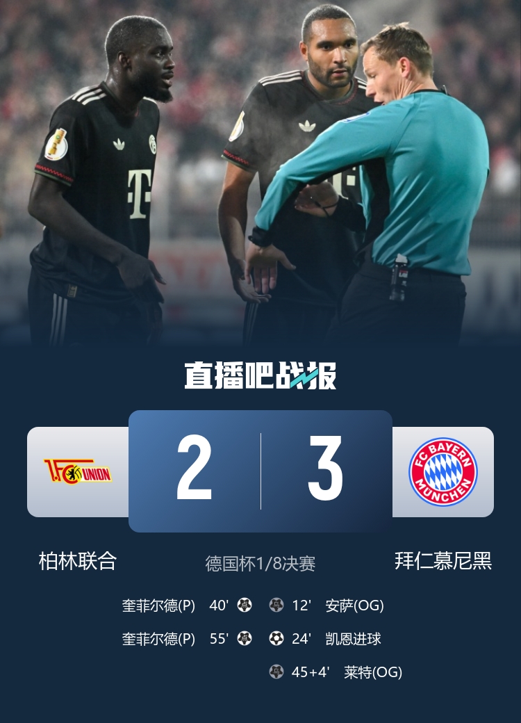 直播吧12月4日讯德国杯1/8决赛,柏林联合主场2-3不敌拜仁,无缘下一轮。