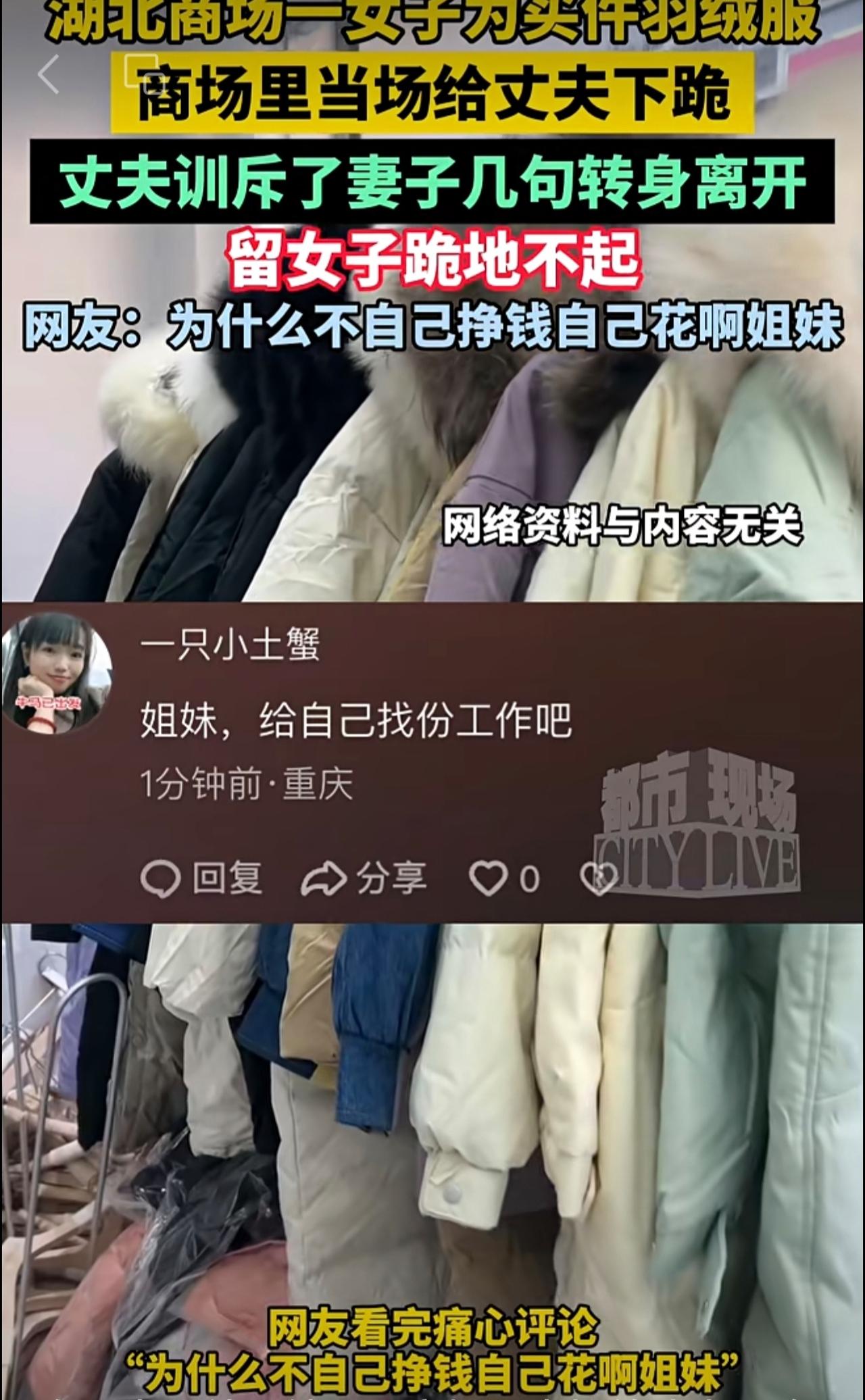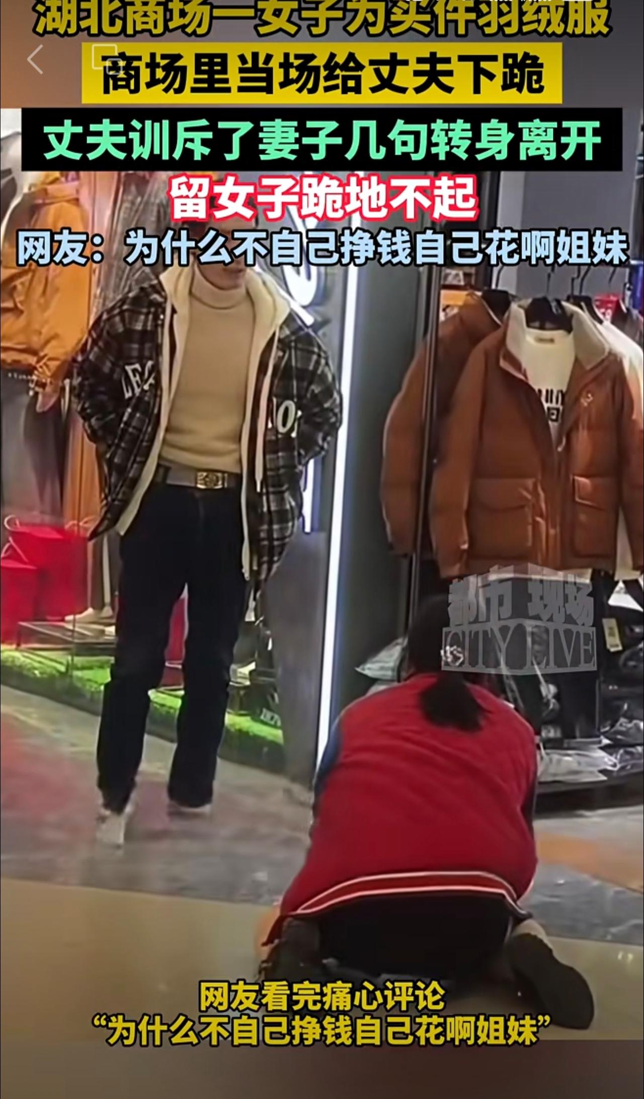 女子为买件羽绒服,商场里当场给丈夫下跪,竟转身独自离开,留下女子跪地不起。