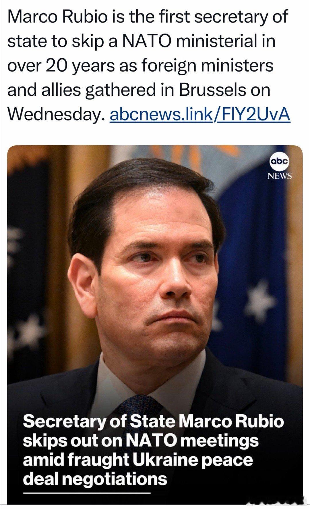 北约外长布鲁塞尔会议,Rubio没有参加美国国务卿缺席,二十多年来首次川氏政权传