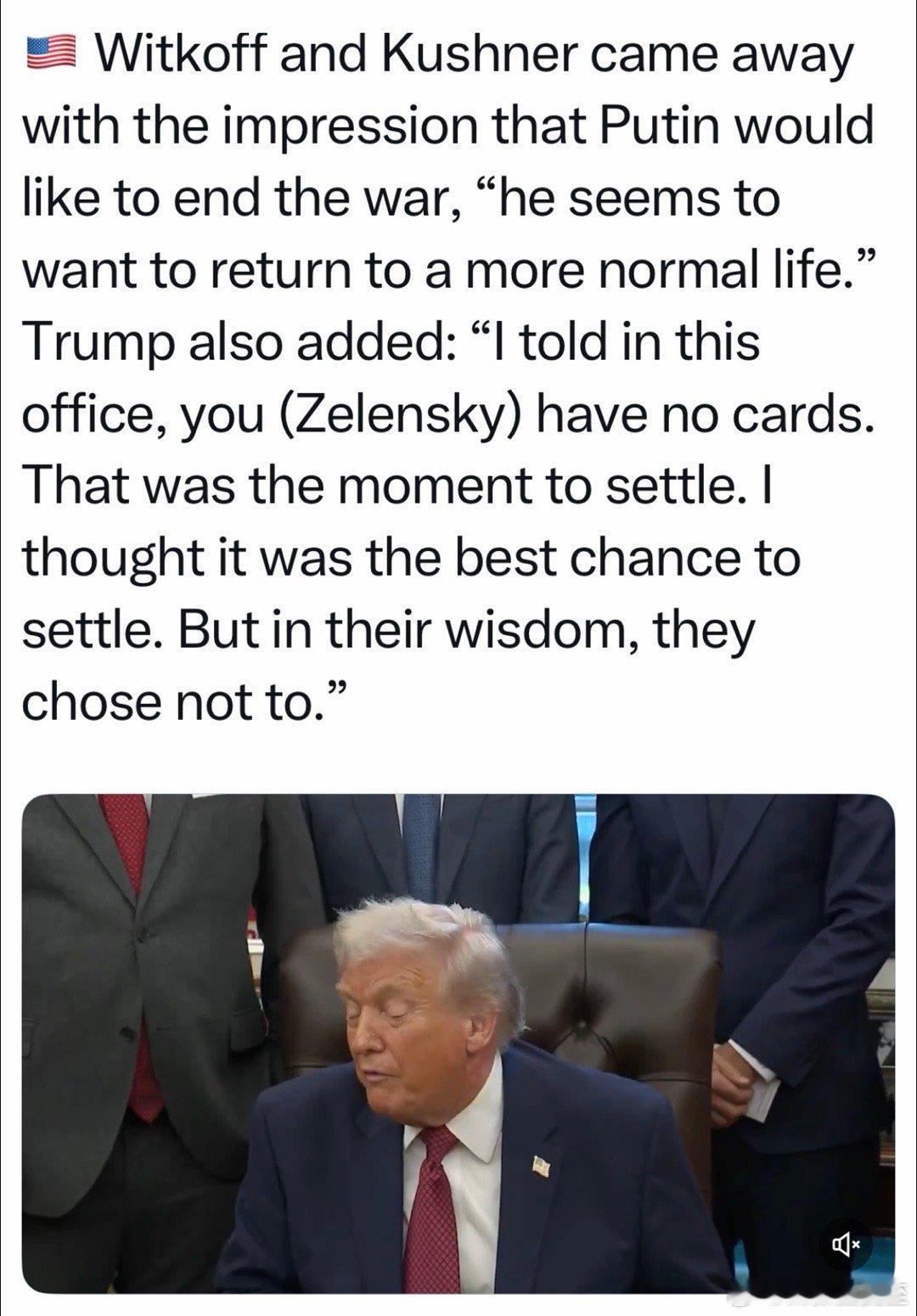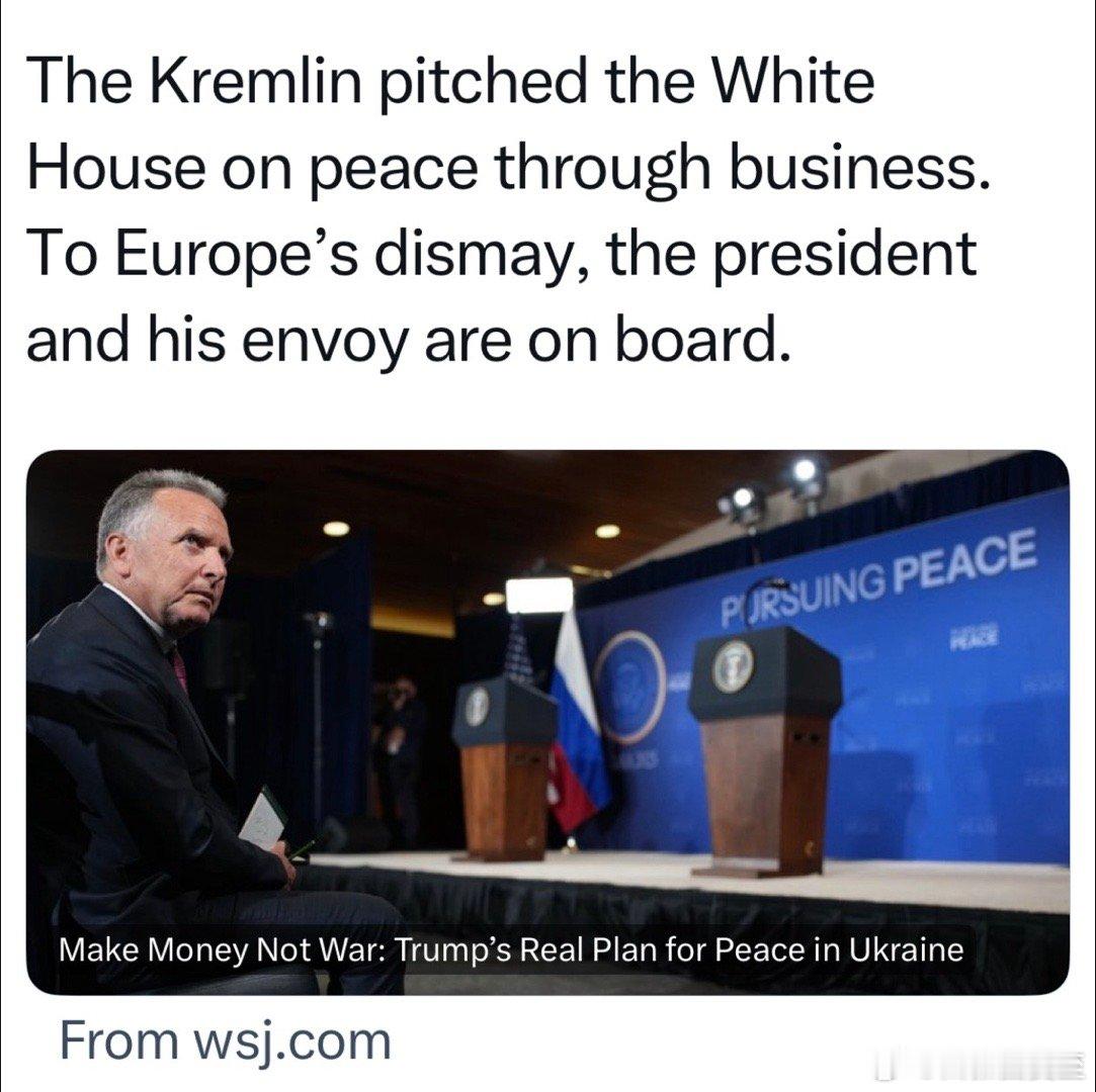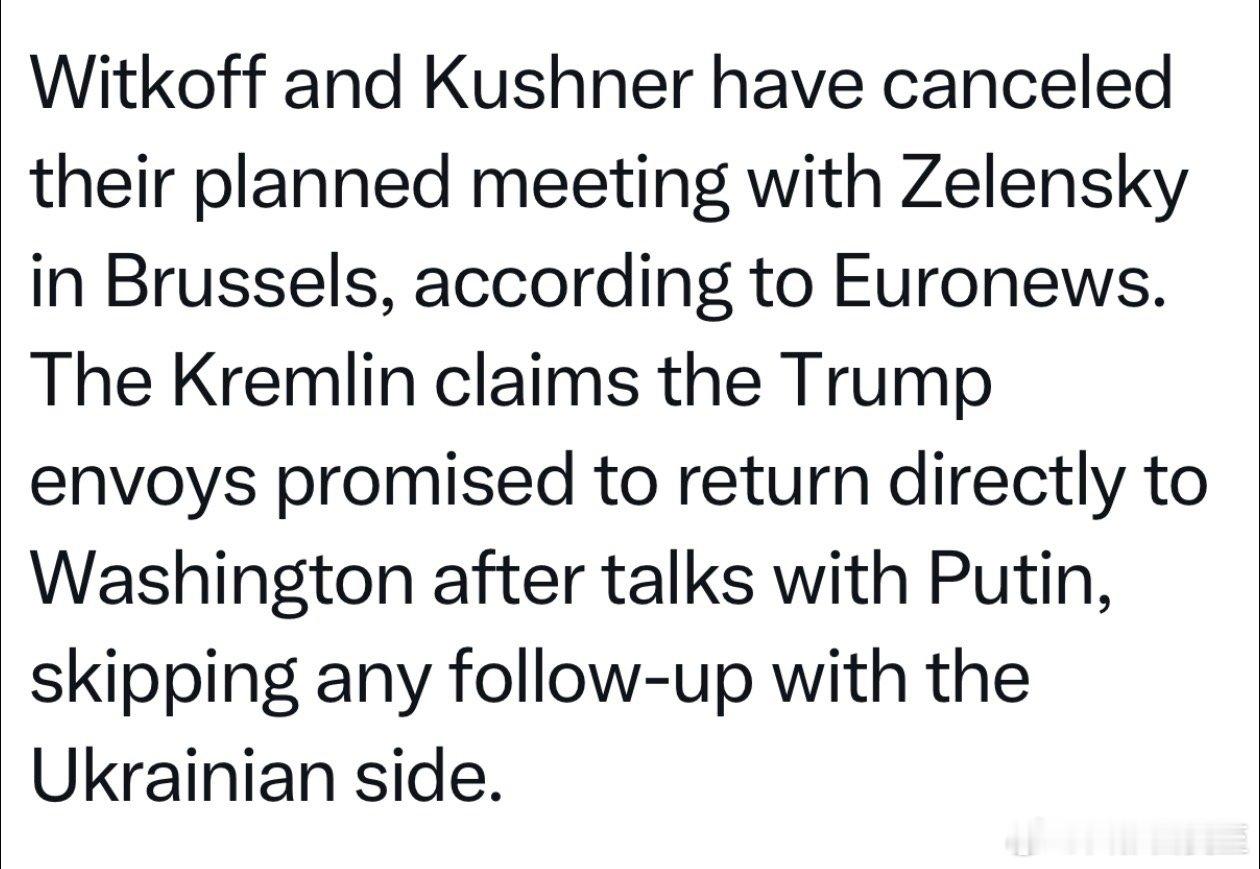 美国总统特使和女婿,原计划见俄总统后,到布鲁塞尔见乌克兰总统在克宫承诺“直接回国”,取消了与Zelensky的会面向美国总统汇报:Putin愿意结束战争、回归正常生活Trump评论:我早说过,乌克兰没有牌,那时候就该和解,是最佳时机,但他们不愿意,不知怎么想的美媒报道:俄吸引白宫配合,诱饵是“经济合作”,川氏政权及亲友,将有机会与俄做生意,施压乌克兰尽快接受俄方条件、尽早停火,符合商业利益