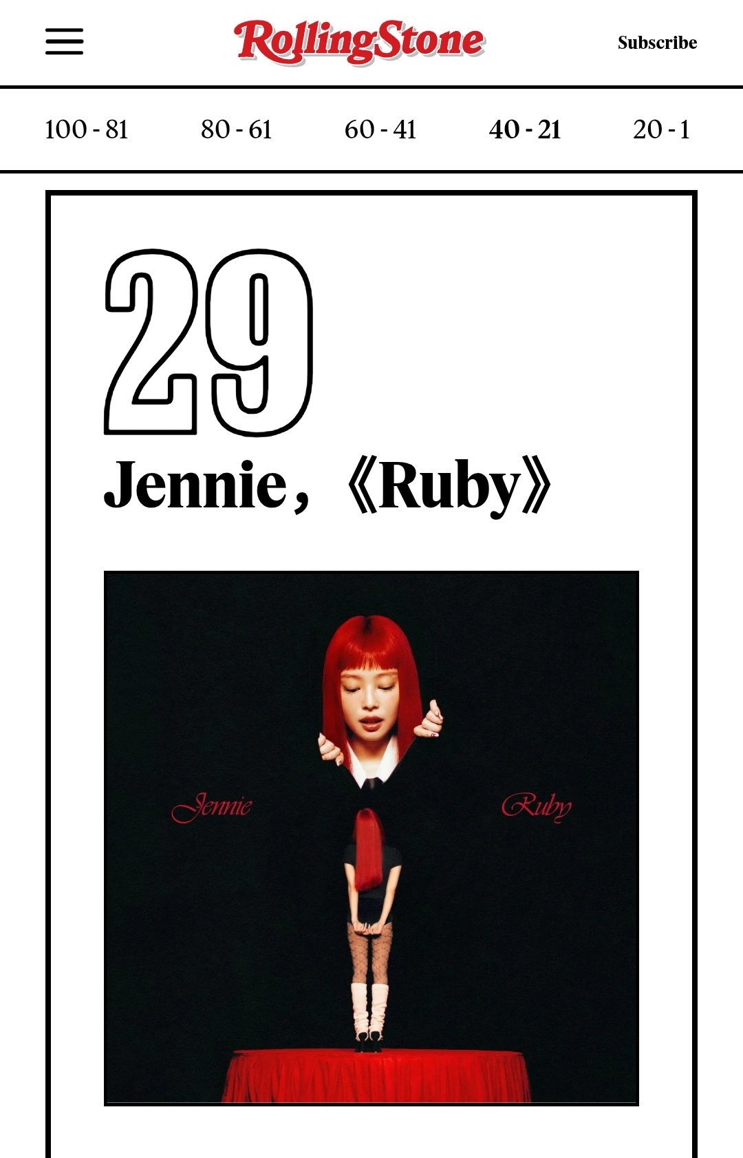 Jennie的首张录音室专辑《Ruby》入选Rolling Stone 2025 百大专辑年榜,排名第29,同时也是KPOP专辑中排名最高的存在!!!太牛了🔥🔥🔥
