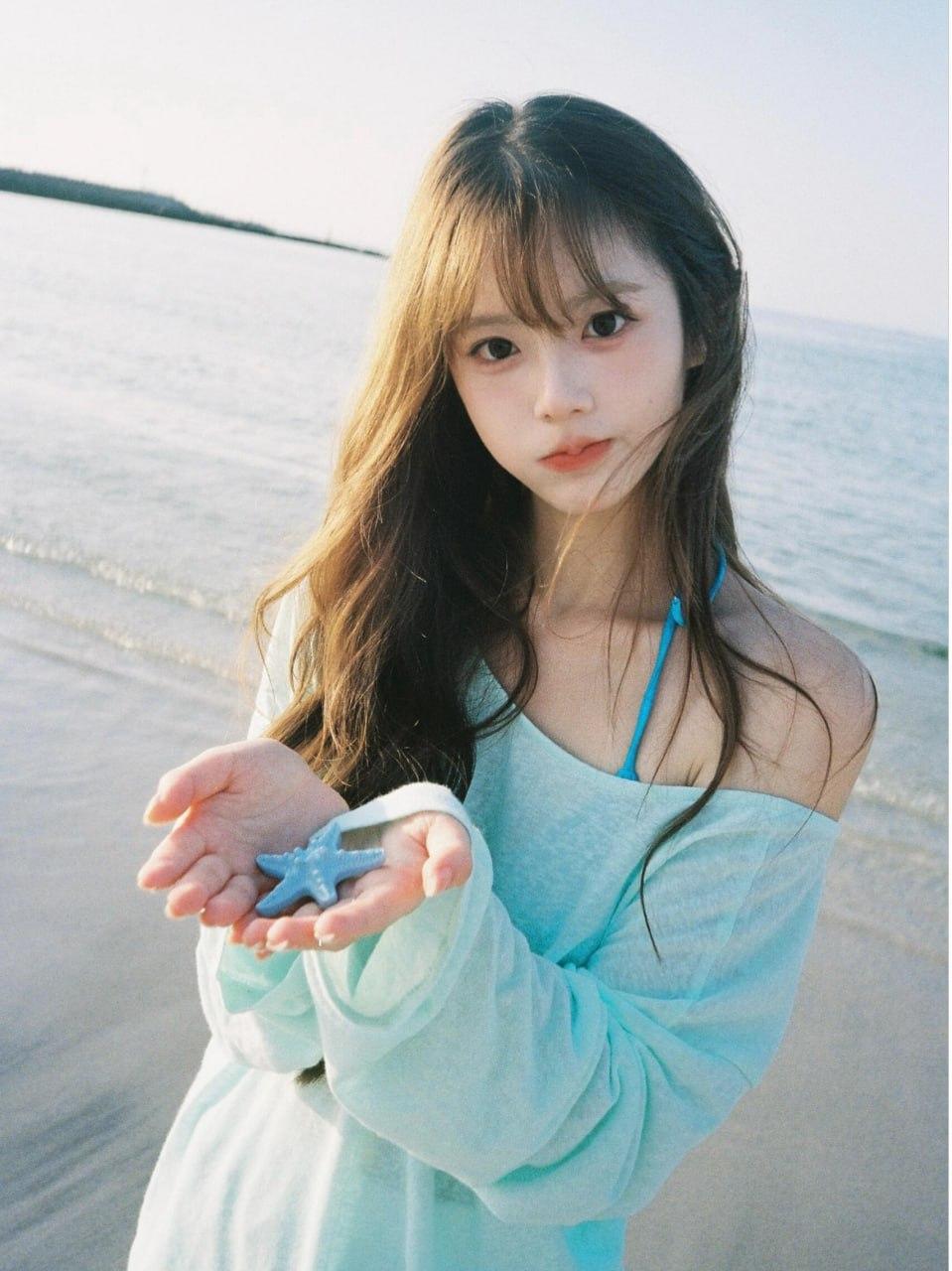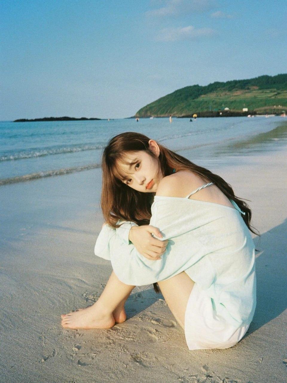 一位长发女孩跪坐在沙滩上,她身着浅蓝色露肩长袖上衣和白色短裤,赤着双脚。女孩伸出手指,指向沙滩上用心形沙纹所表达的某种情感(或爱意、或浪漫等)。她的头发自然垂落,发梢微微卷曲,面容姣好,眼神温柔地看向镜头方向 。 你是否觉得招人喜欢?