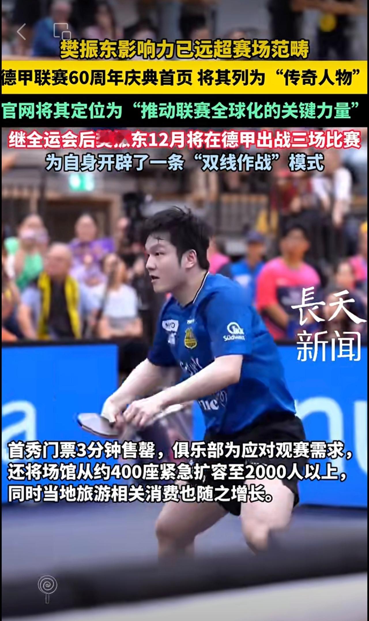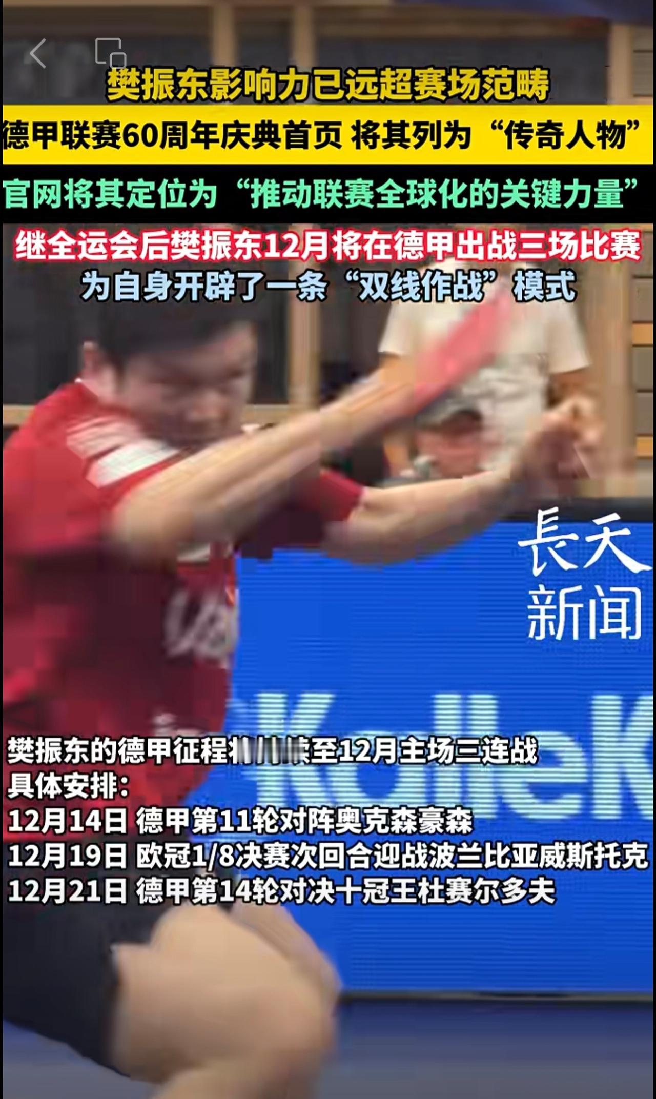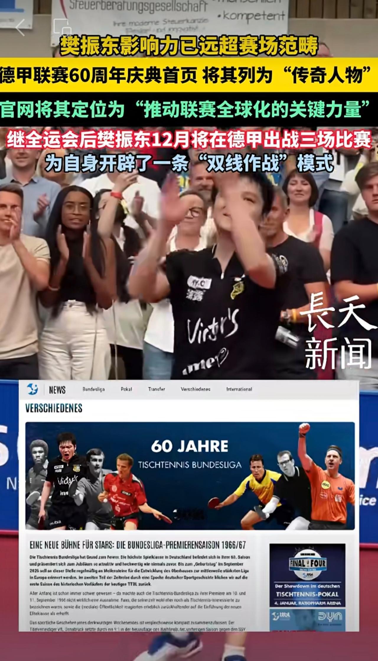 德甲联赛60周年庆典首页,将樊振东列为“传奇人物”!官网将其定位为“推动联赛全球化的关键力量”,继全运会后樊振东12月将在德甲出战三场比赛,让我们拭目以待!乒乓球德甲联赛