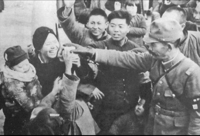 这张照片被标注为“1938年初华北某地”,前排几个国人举手抢东西,表情夸张得近乎滑稽,镜头感极强,这在极度恐惧环境下的真实难民身上几乎不可能出现(真实难民儿童见到日军通常吓得不敢出声),后排还有人专门做出“欢呼”姿势,完全是典型的宣传摆拍手法。 而日军真正的“分发物资”往往是把食物丢在地上,逼难民趴着去抢,同时拍照取乐。把这张照片拿出来宣称“看,日军也有善良一面”,无异于在奥斯维辛集中营门口拍一张党卫军给犹太儿童发糖果的摆拍,然后说“纳粹对犹太人也不完全是坏的”。