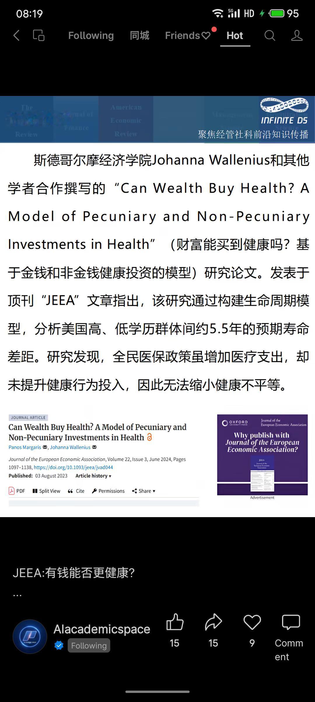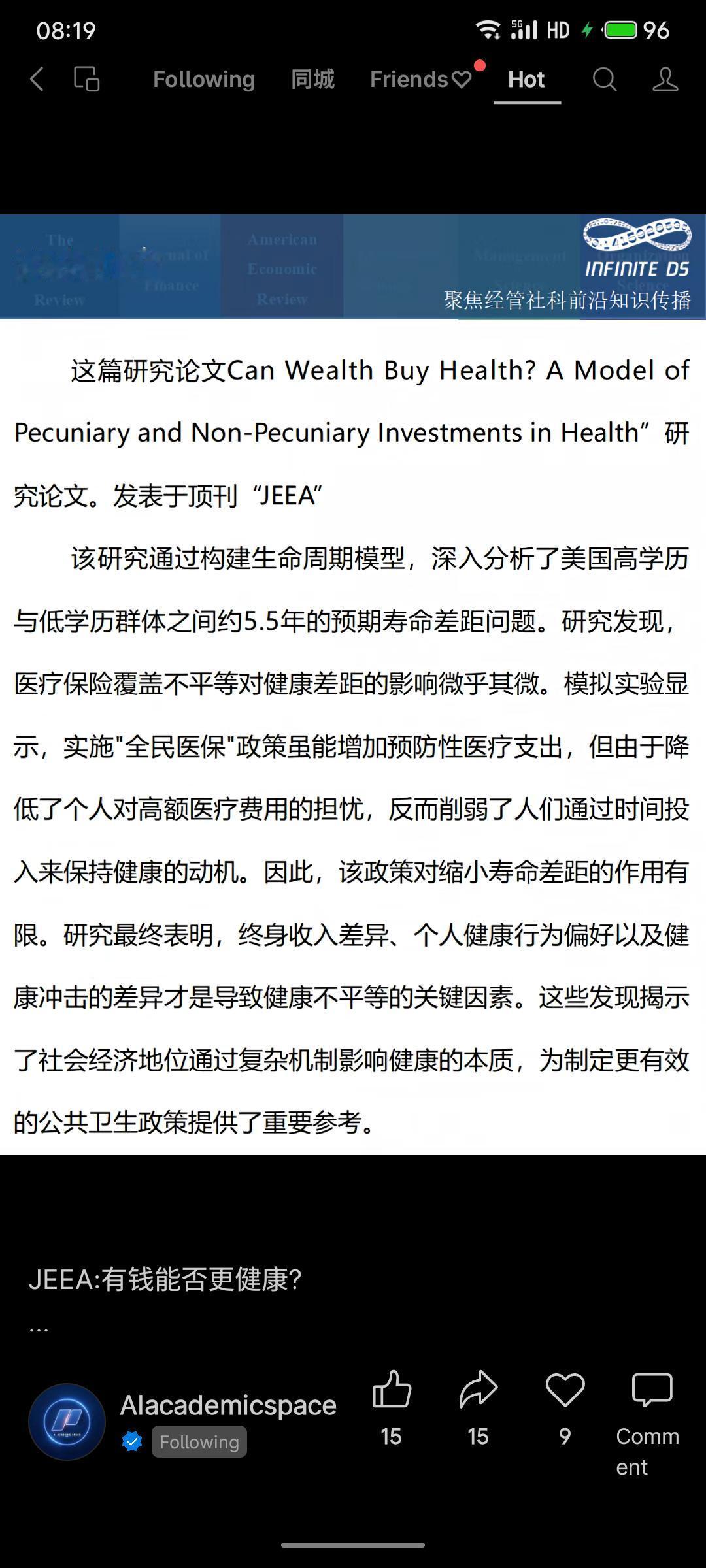 该研究通过构建生命周期模型,分析了美国高、低学历群体间的预期寿命差距。其核心发现是,全民医保等经济干预虽能增加医疗支出,但可能削弱个人健康行为的投入动机,因而对缩小健康不平等作用有限。研究指出,终身收入、健康行为偏好及健康冲击差异才是关键。这一结论揭示了健康不平等成因的复杂性,对公共卫生政策具有重要参考价值。